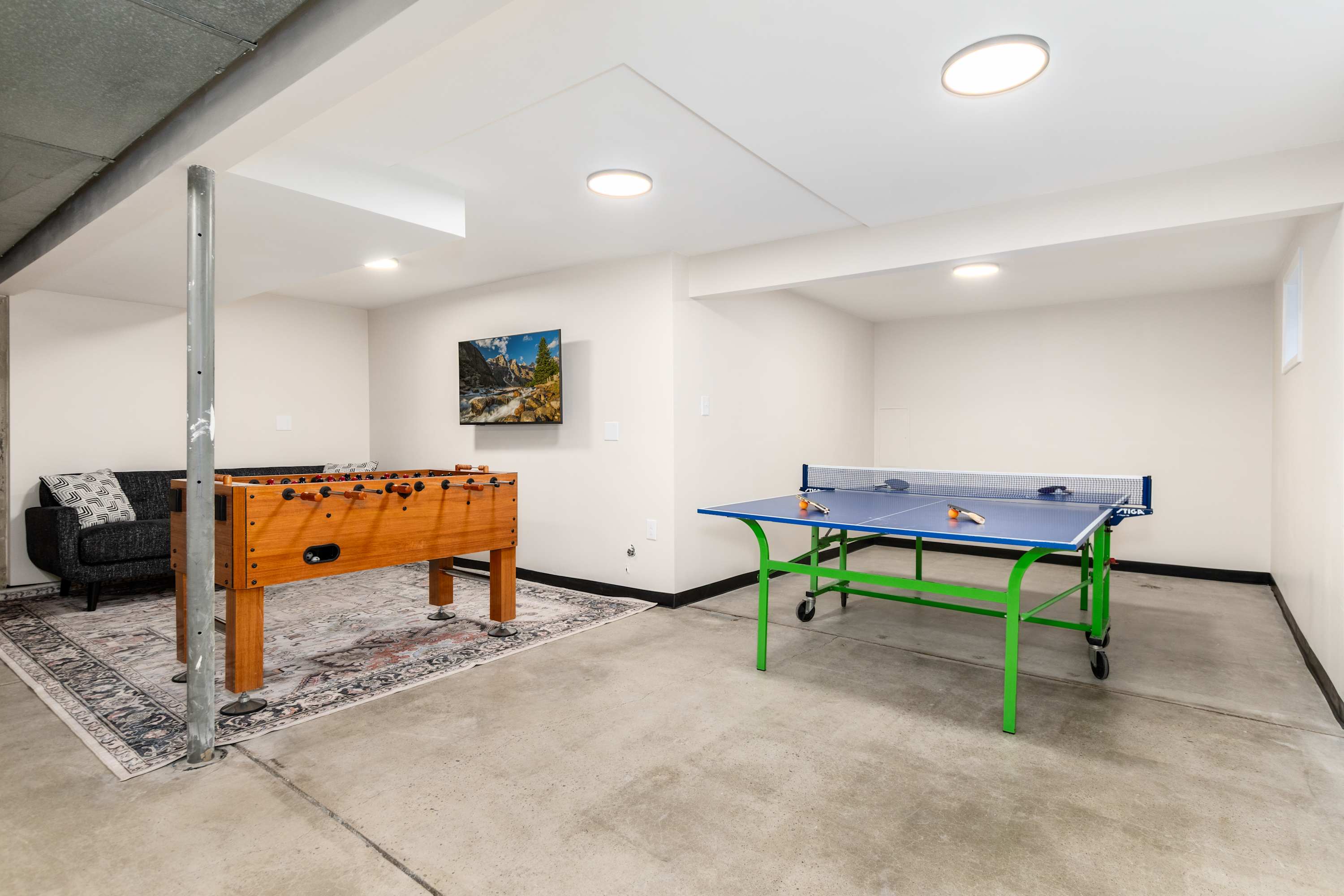 • Basement game room with foosball, board games, and sleeper sofa