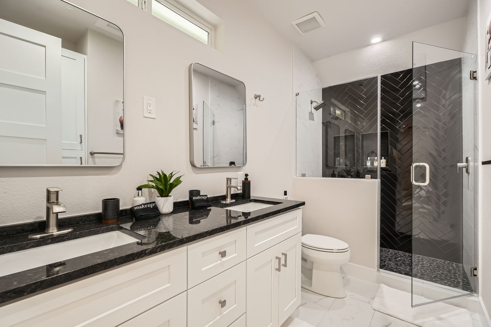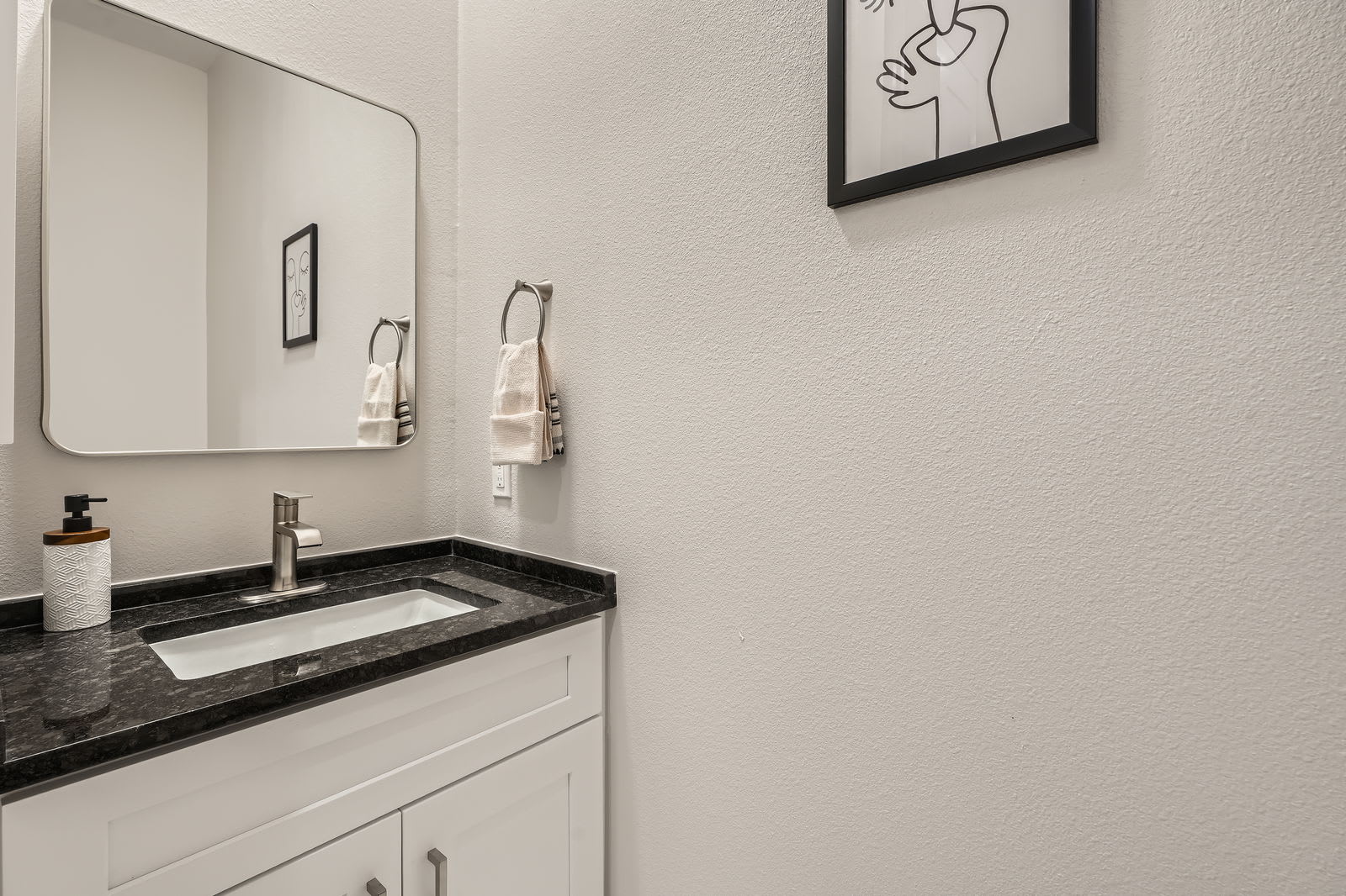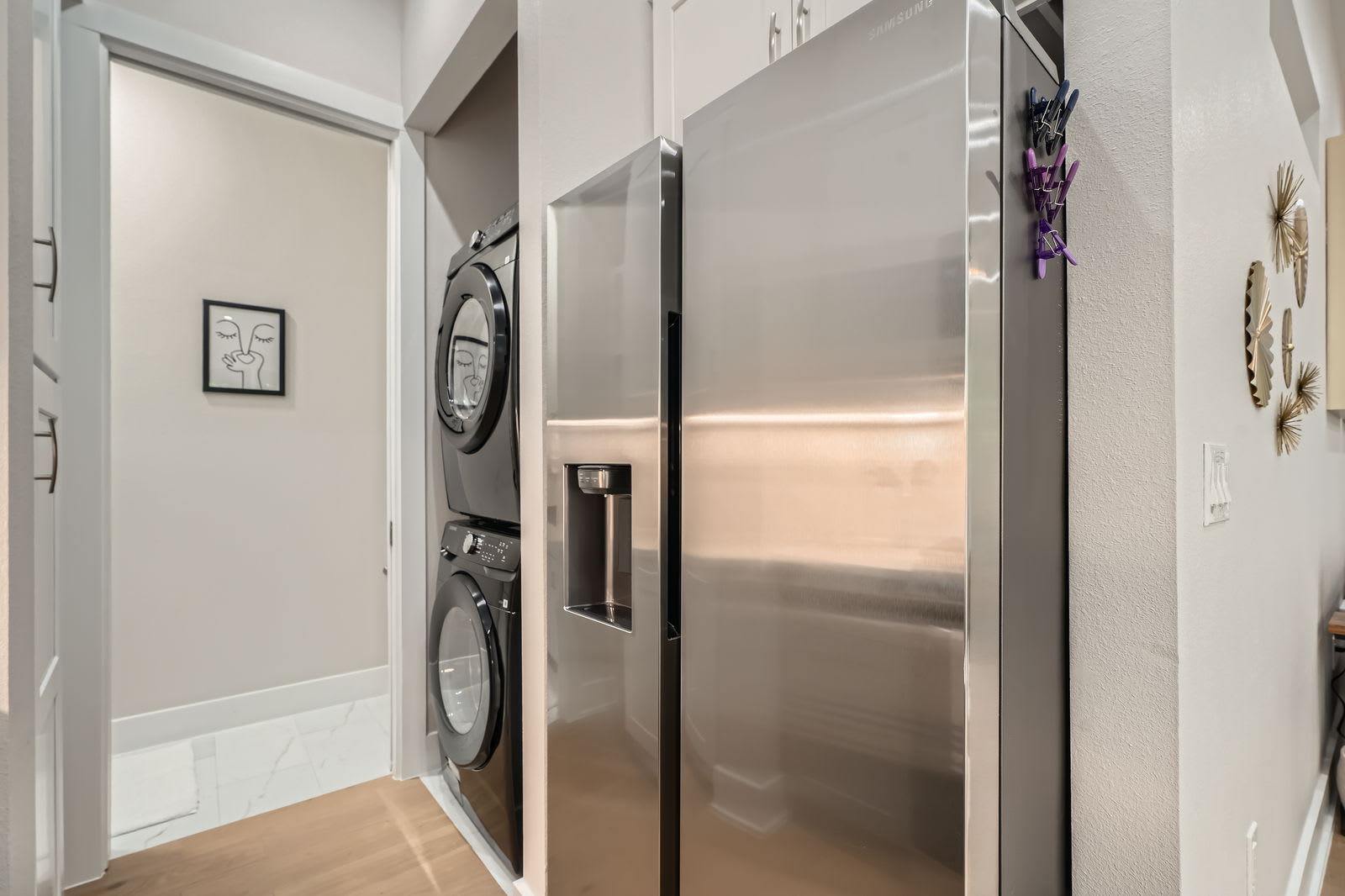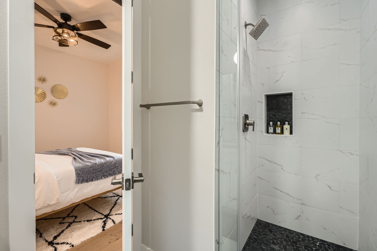 The sleek kitchen is fully equipped with stainless steel appliances, quartz counters, island seating, and all cookware essentials. Whether you’re making breakfast tacos before SXSW, cooking dinner after a day at ACL, or enjoying late-night bites from a local food truck, you’ll have everything you need.