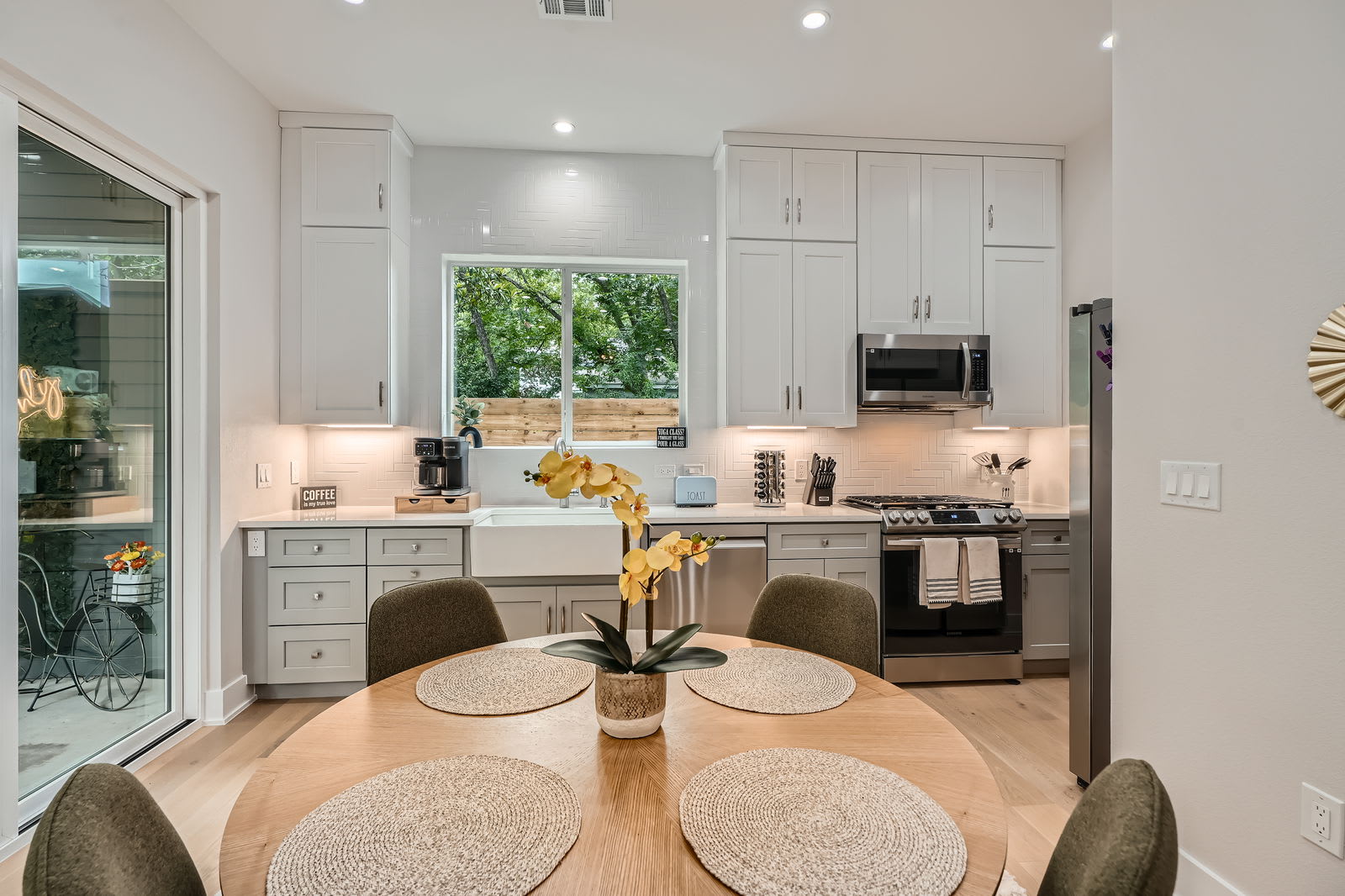 The open-concept living area is bright and airy with large windows and modern décor. It’s the perfect place to relax after exploring East Austin, gather for a movie night on the smart TV, or catch up on work with fast WiFi.