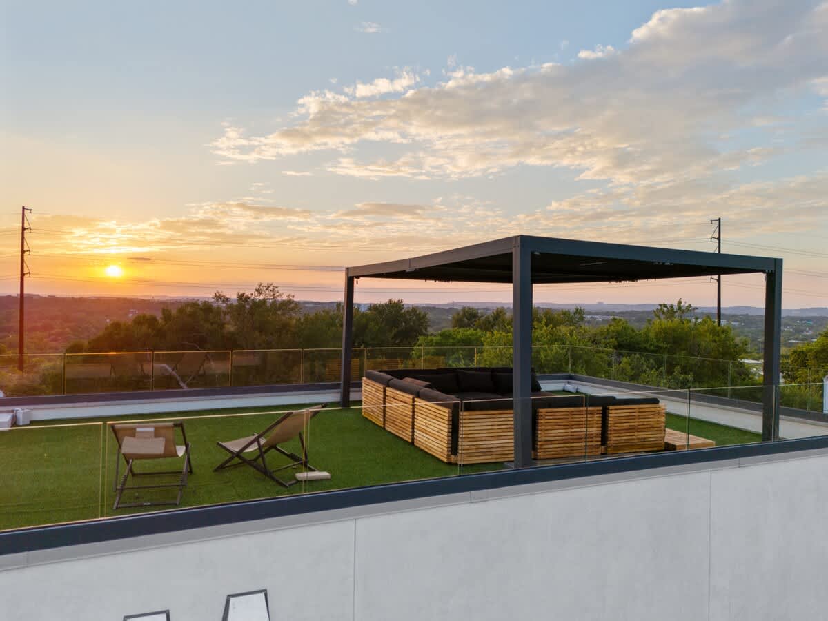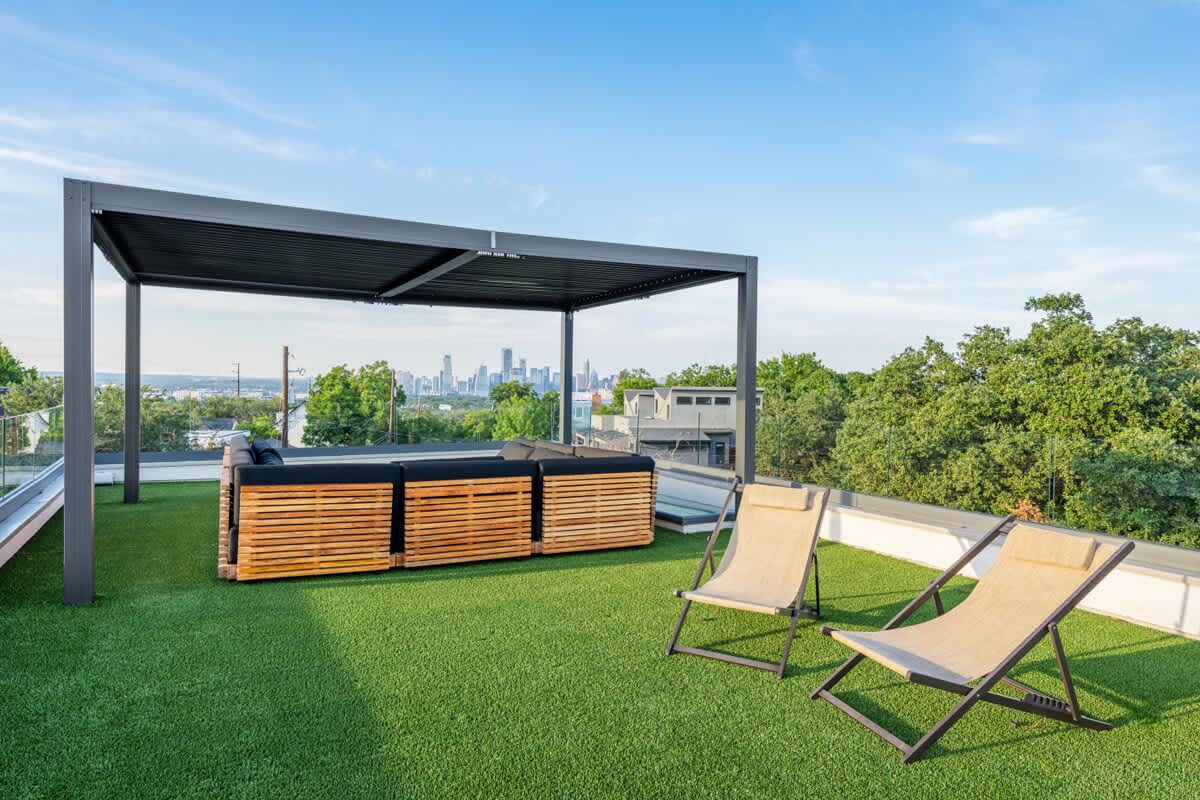 The rooftop lounge offers shaded seating under a pergola, side tables, and panoramic city views...perfect for golden hour hangs or a quiet nightcap.
