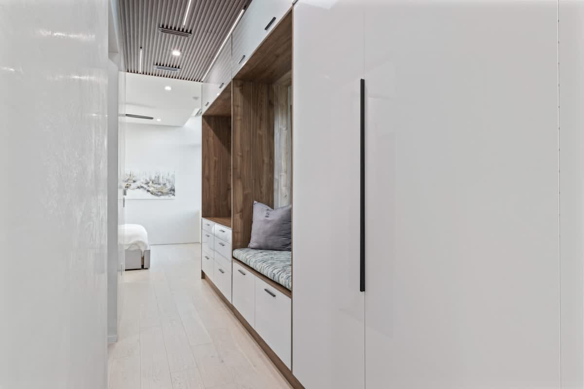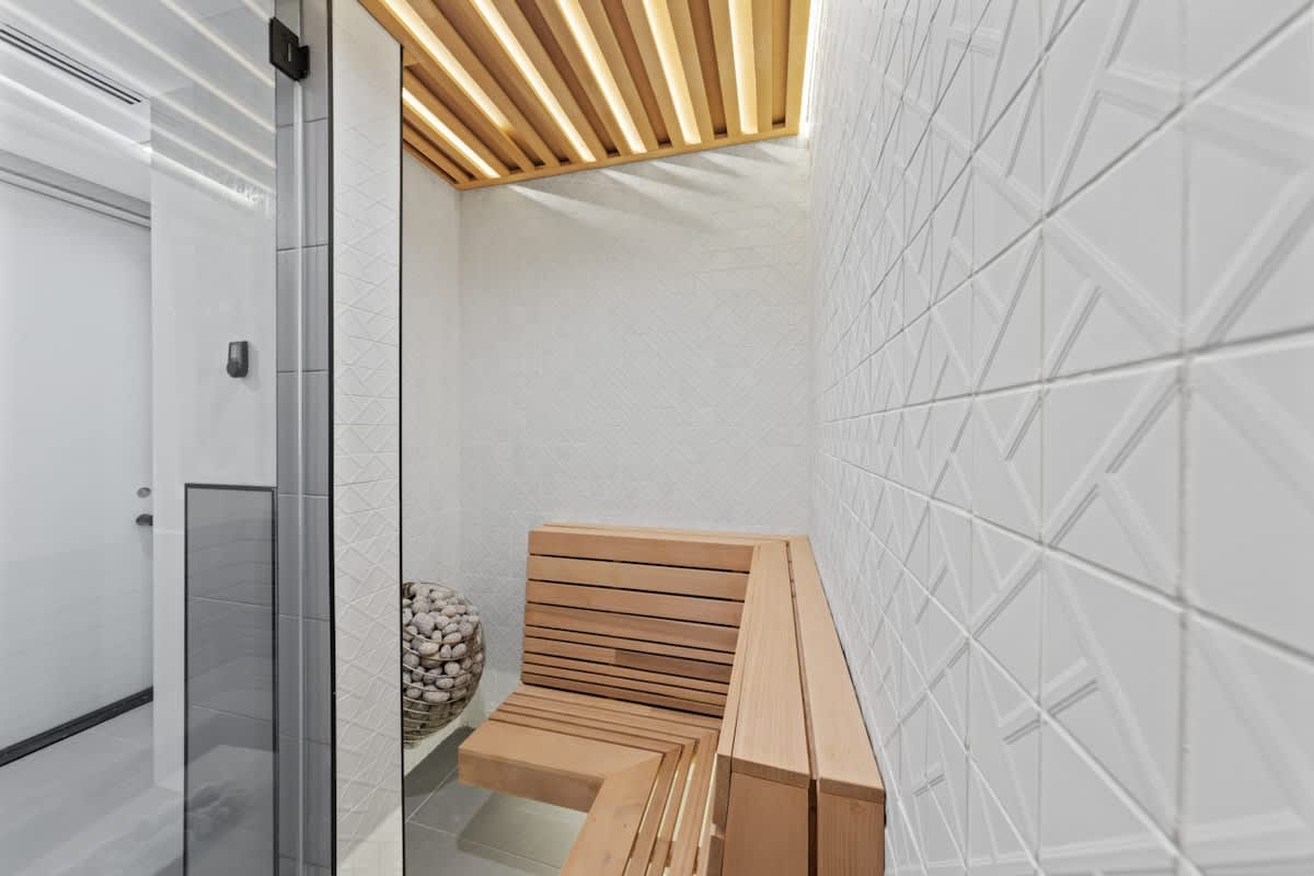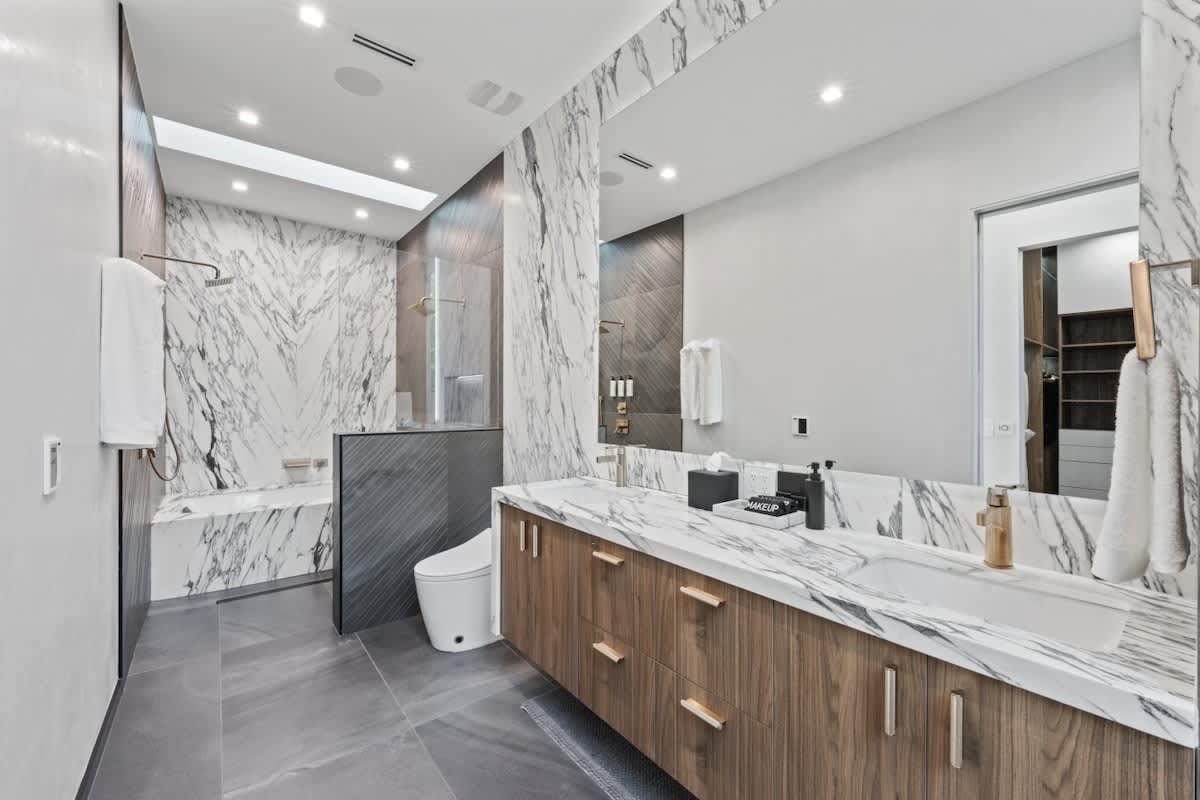 Spacious and serene, featuring a king-size bed, smart TV, adjustable lighting, and an expansive walk-in closet. The ensuite bath is a spa-like dream with double shower heads, soaking tub, smart toilet, and skylight.