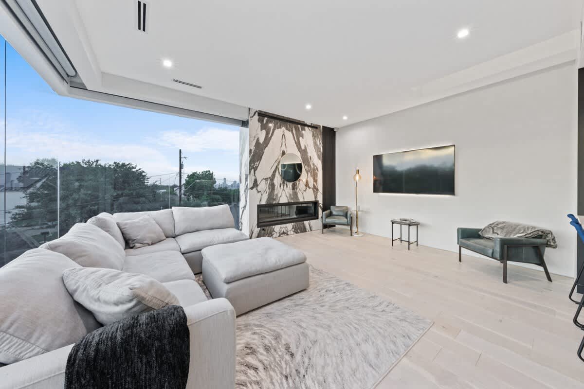 Comfortable and open, with a large sectional, lounge chairs, electric fireplace, and massive TV. Floor-to-ceiling windows bring in natural light and unbeatable city views.