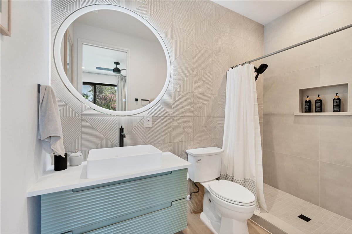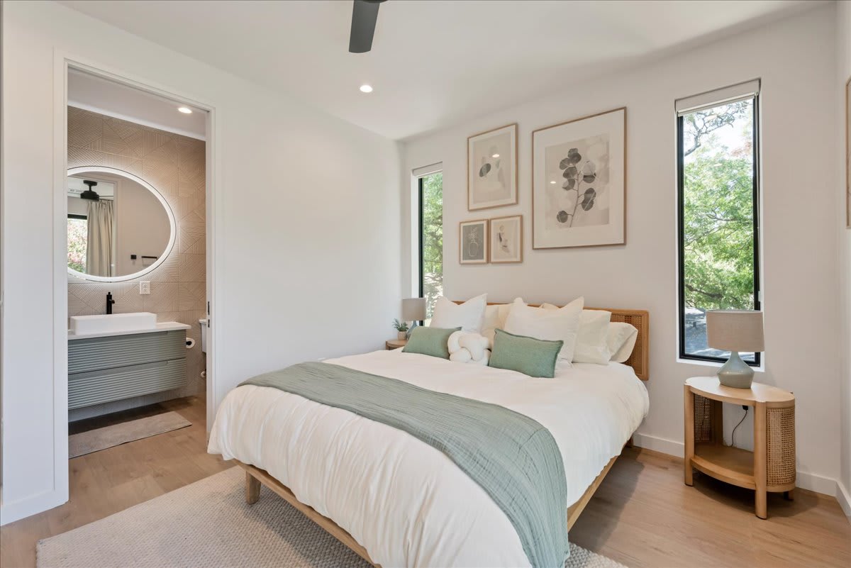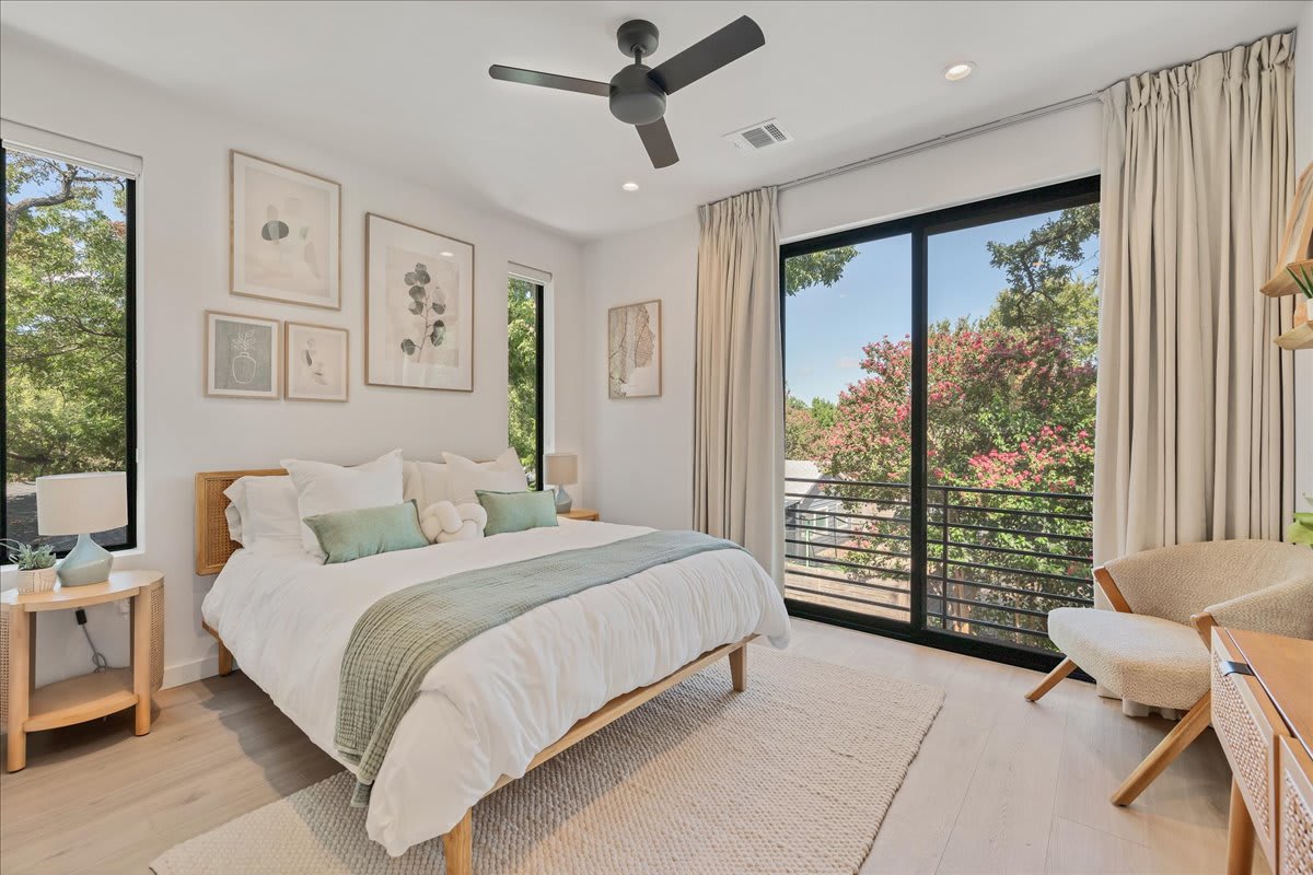 Designed as a relaxing retreat, the home features two beautifully appointed bedrooms with plush queen beds with soft cotton sheets and oversized comforters for a restful night’s sleep. There are three well-designed bathrooms: one custom designed half bath downstairs for guests, one in the primary bedroom that has walk-in shower and lighted mirror, and one en suite in the second bedroom with a deep bathtub for soaking. Each has shampoo, conditioner, and body wash with towels.The primary bedroom has a balcony where you can catch the amazing violet sunsets that Austin offers in the winter.