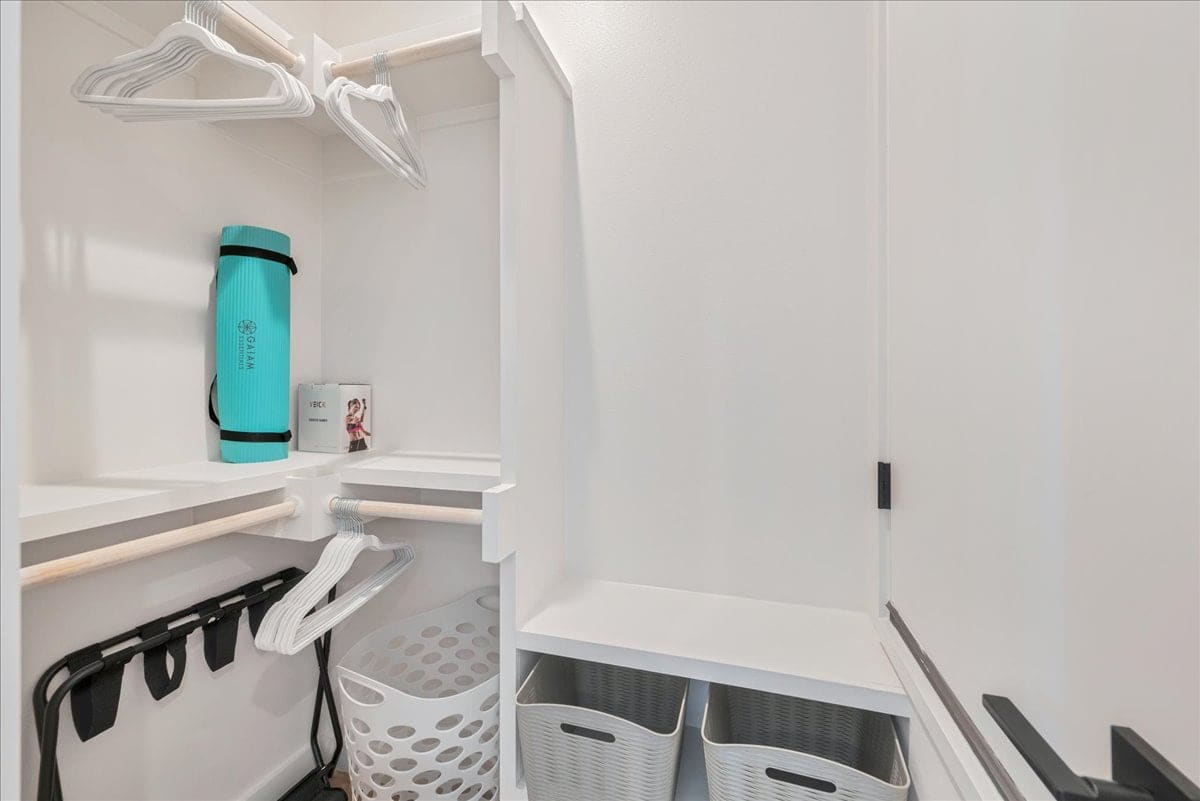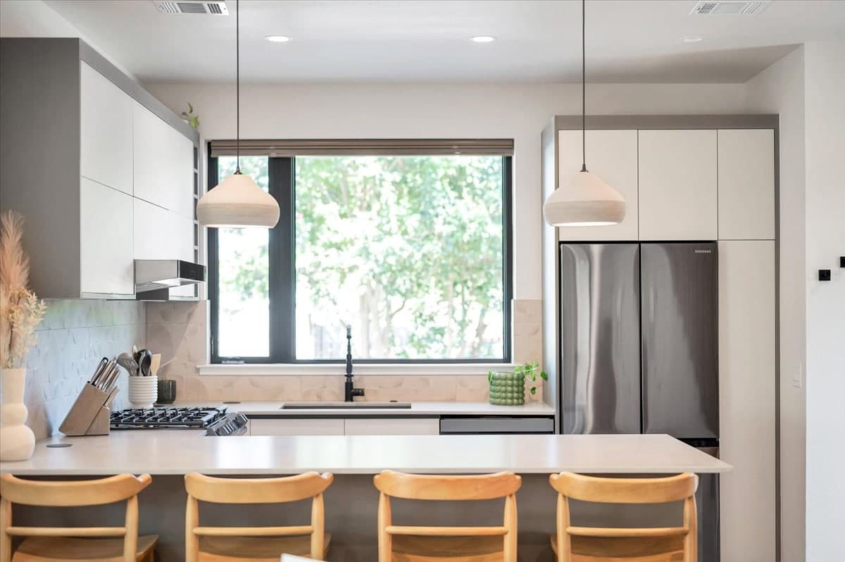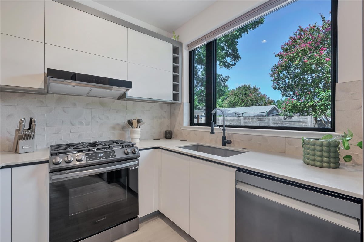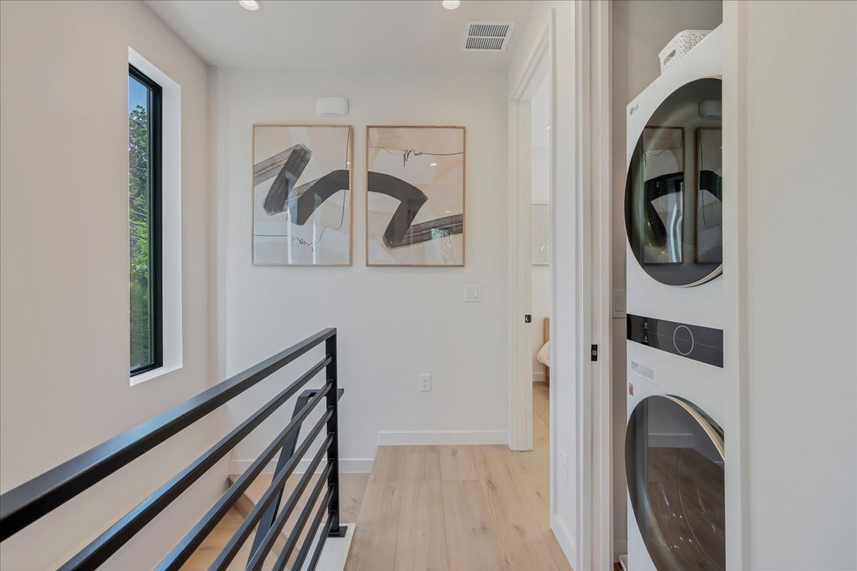 Designed as a relaxing retreat, the home features two beautifully appointed bedrooms with plush queen beds with soft cotton sheets and oversized comforters for a restful night’s sleep. There are three well-designed bathrooms: one custom designed half bath downstairs for guests, one in the primary bedroom that has walk-in shower and lighted mirror, and one en suite in the second bedroom with a deep bathtub for soaking. Each has shampoo, conditioner, and body wash with towels.The primary bedroom has a balcony where you can catch the amazing violet sunsets that Austin offers in the winter.