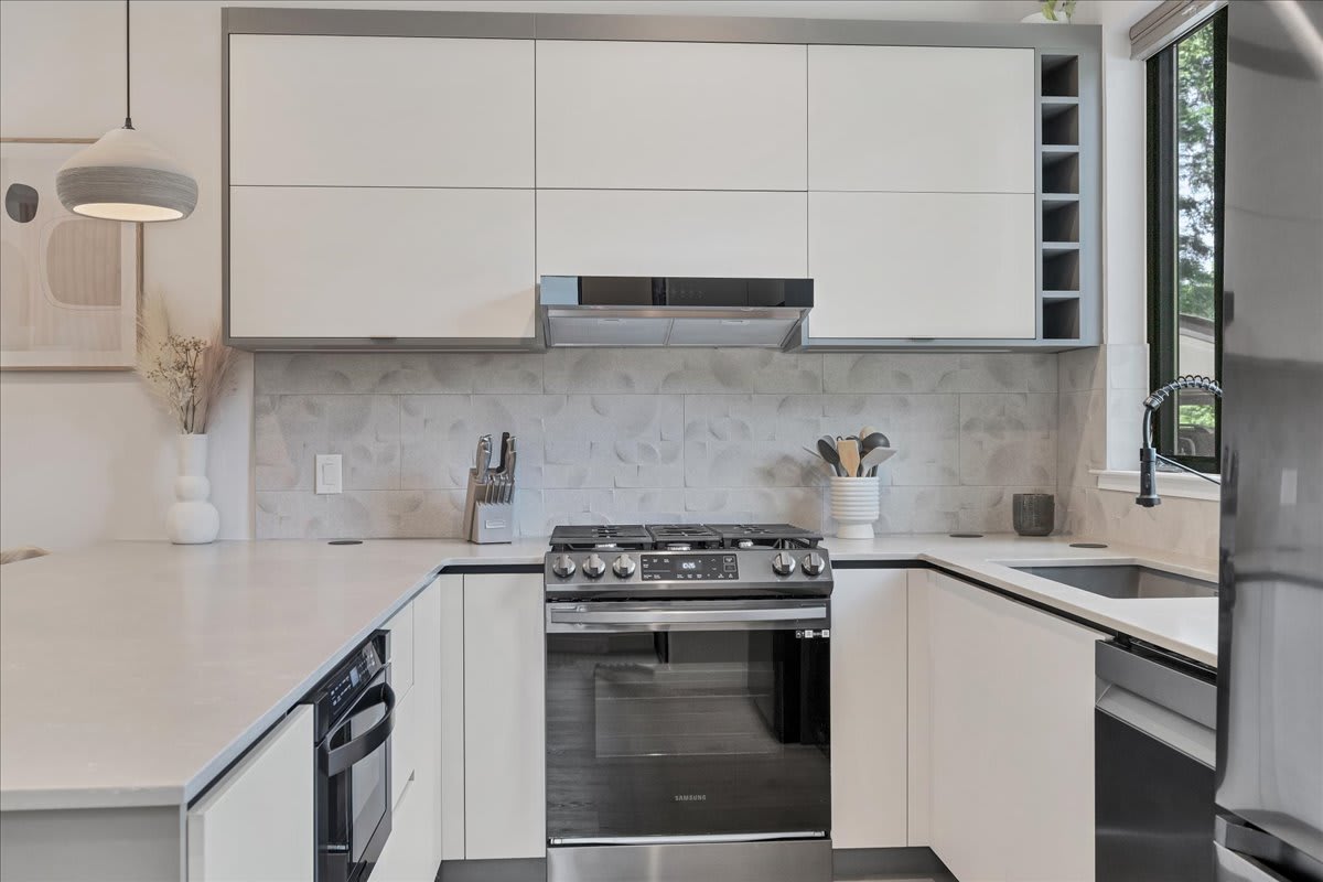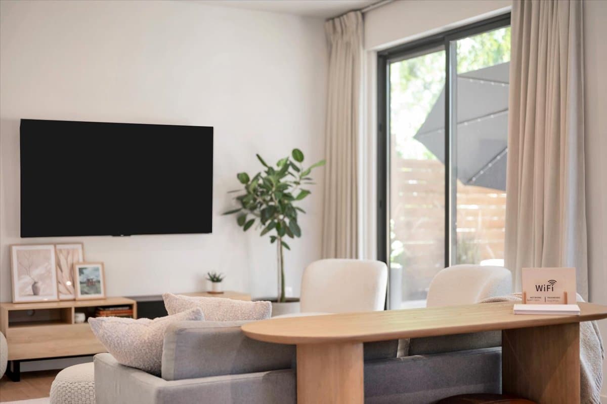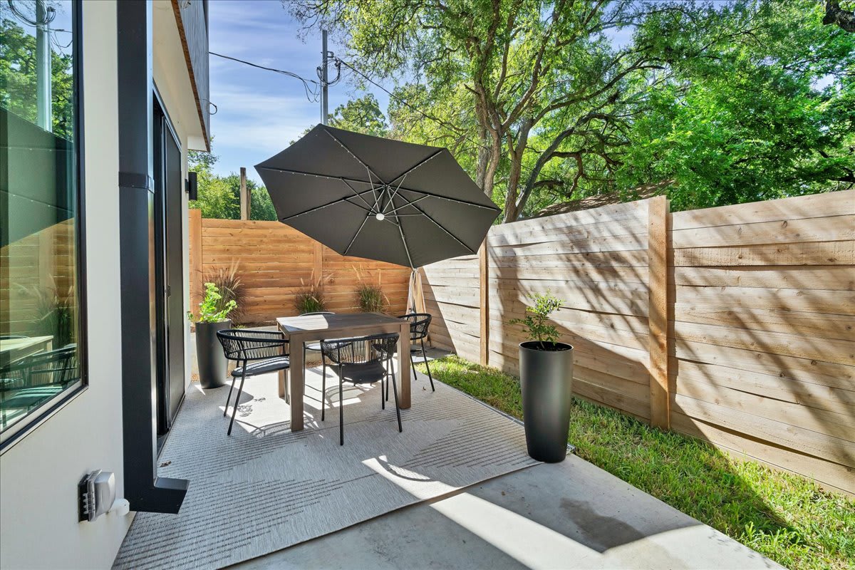 The kitchen is well-stocked with everything you need, including a gas stove, oven, under counter microwave, coffee maker, mixer, wine glasses and more, making it easy to prepare meals. For those who love to cook, you’ll find several amazing grocery stores nearby, including walkable Sprouts, 2 HEBs, and Central Market, perfect for sourcing fresh ingredients and preparing a gourmet meal. Enjoy your creations on the outdoor fenced-in patio, which features a dining table, plants, and an umbrella for shade. The living room, with a sofa bed, offers extra comfort for unwinding, or accommodating additional guests.