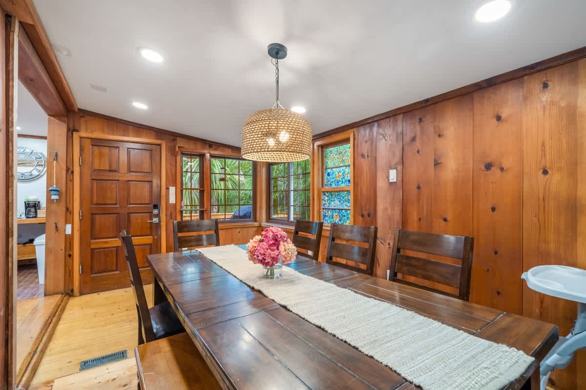 • A dining + kitchen area stocked for group meals