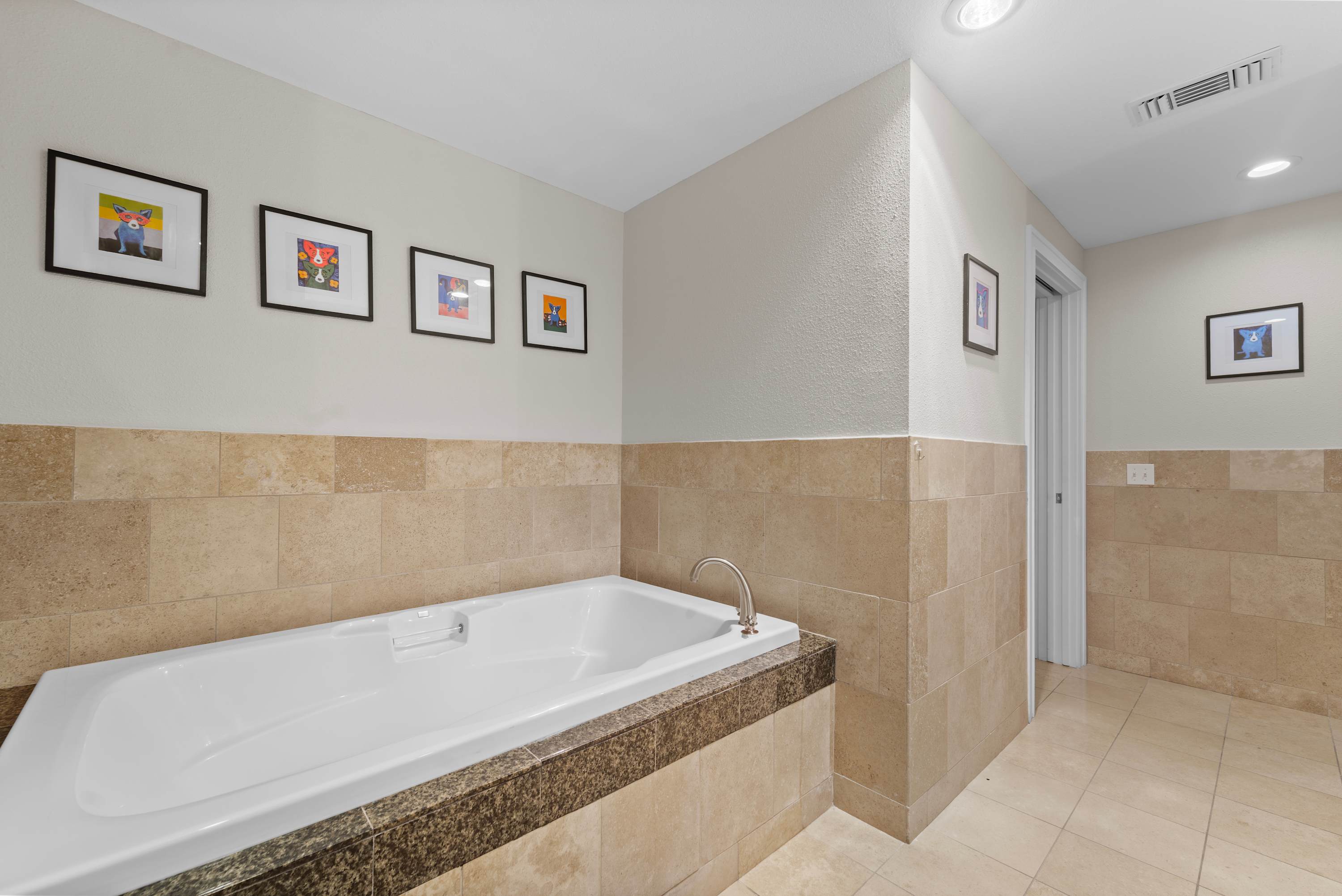• Primary bedroom with a king bed, balcony access, and a spacious ensuite bath