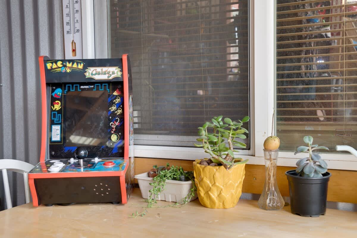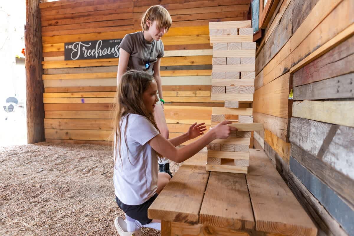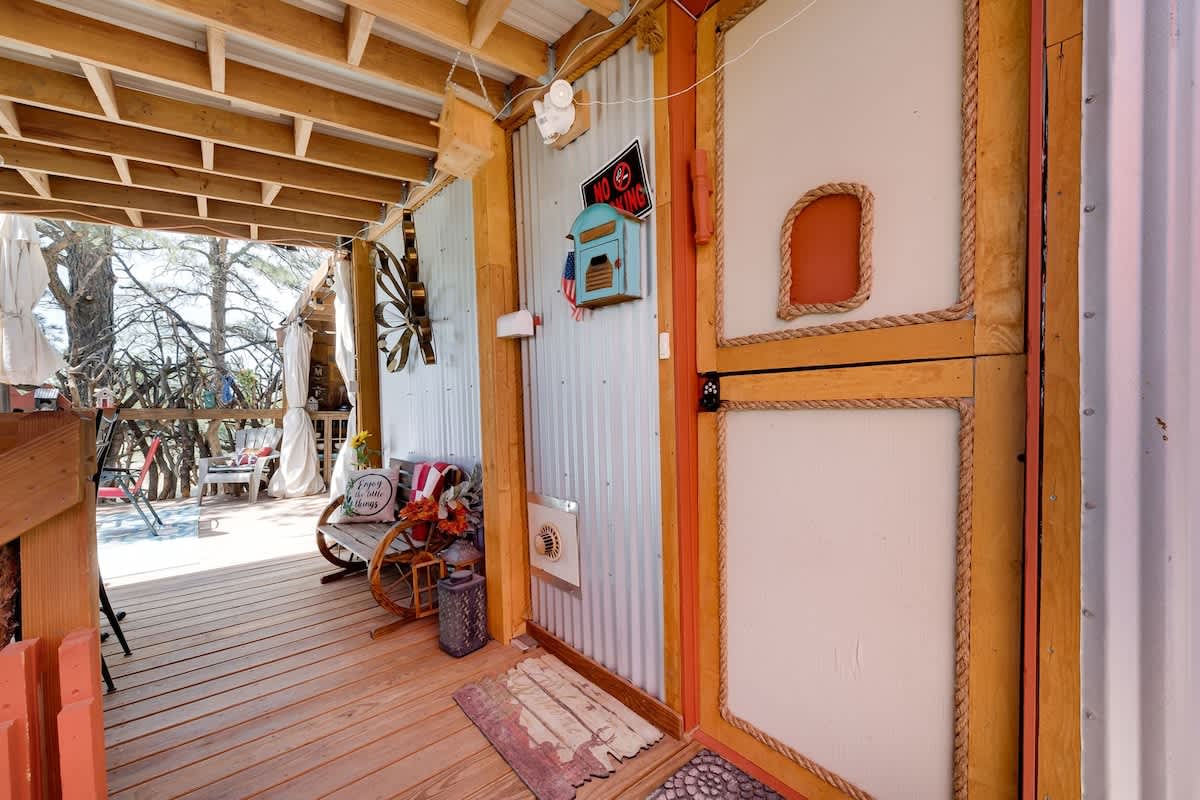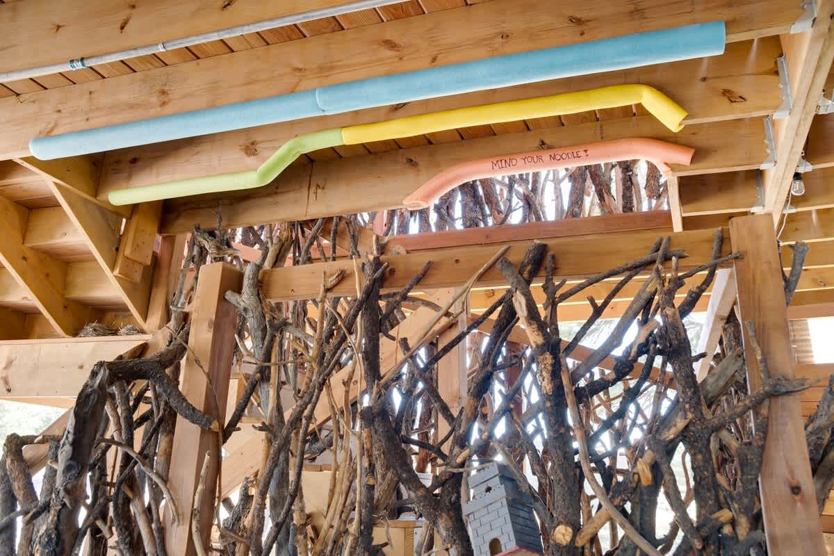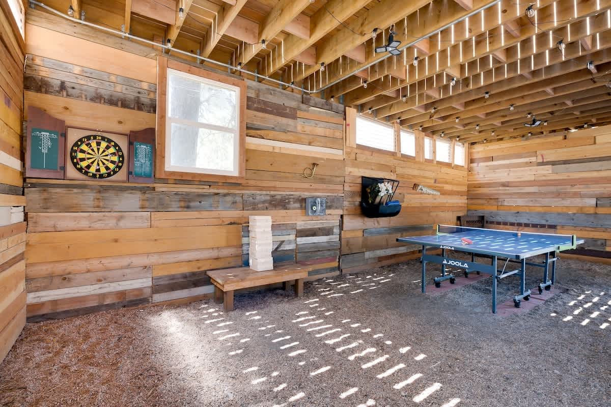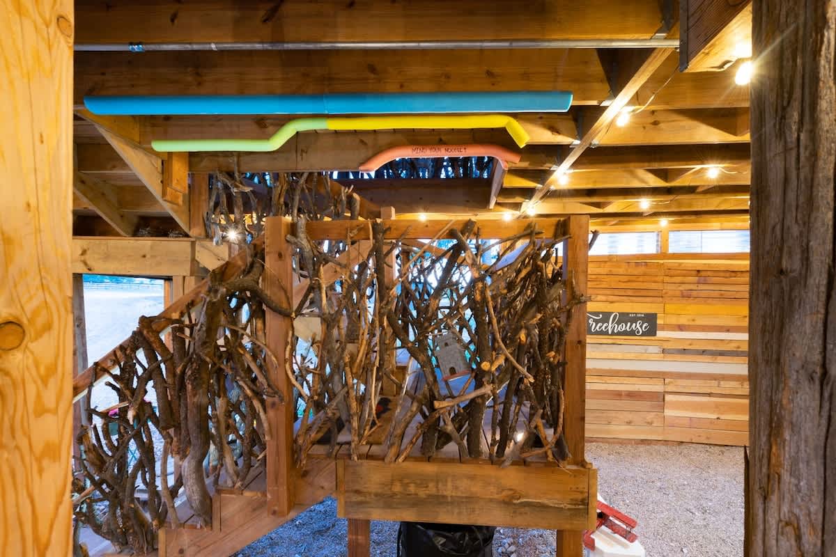 Upon arrival at Treehouse Magic, you'll find yourself parking beneath the deck, which doubles as a convenient carport. Before ascending to the treehouse, indulge in the game room, featuring a ping pong table, darts, a hook and ring game, and Giant Jenga. As you make your way up the stairs, remember to "Mind Your Noodle"!