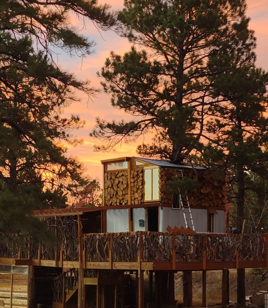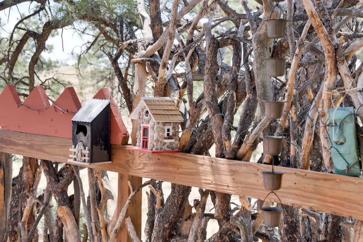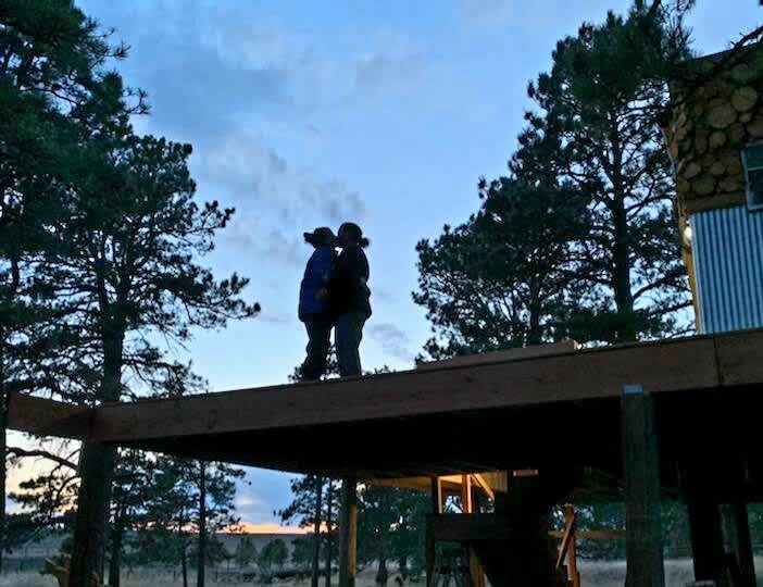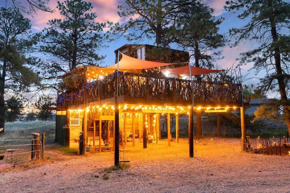 Luxury Glamping NO MATTER THE SEASON...Sun, Rain or Snow! Escape the hustle and bustle of the city and experience this Magical Treehouse! A real treehouse built around PAL a majestic Ponderosa Pine Tree! allSEASON, semi OFF-GRID treasure. Truly "glamping at its finest!" All of the "creature" comforts of home...Located at an elevation of 6476 feet above sea level, on an 80-acre horse ranch, with horses, alpacas, llamas and goats in the heart of Elizabeth, Colorado!!