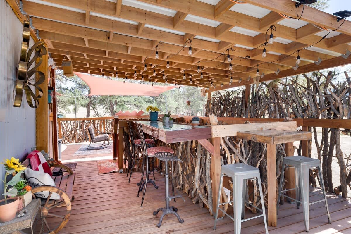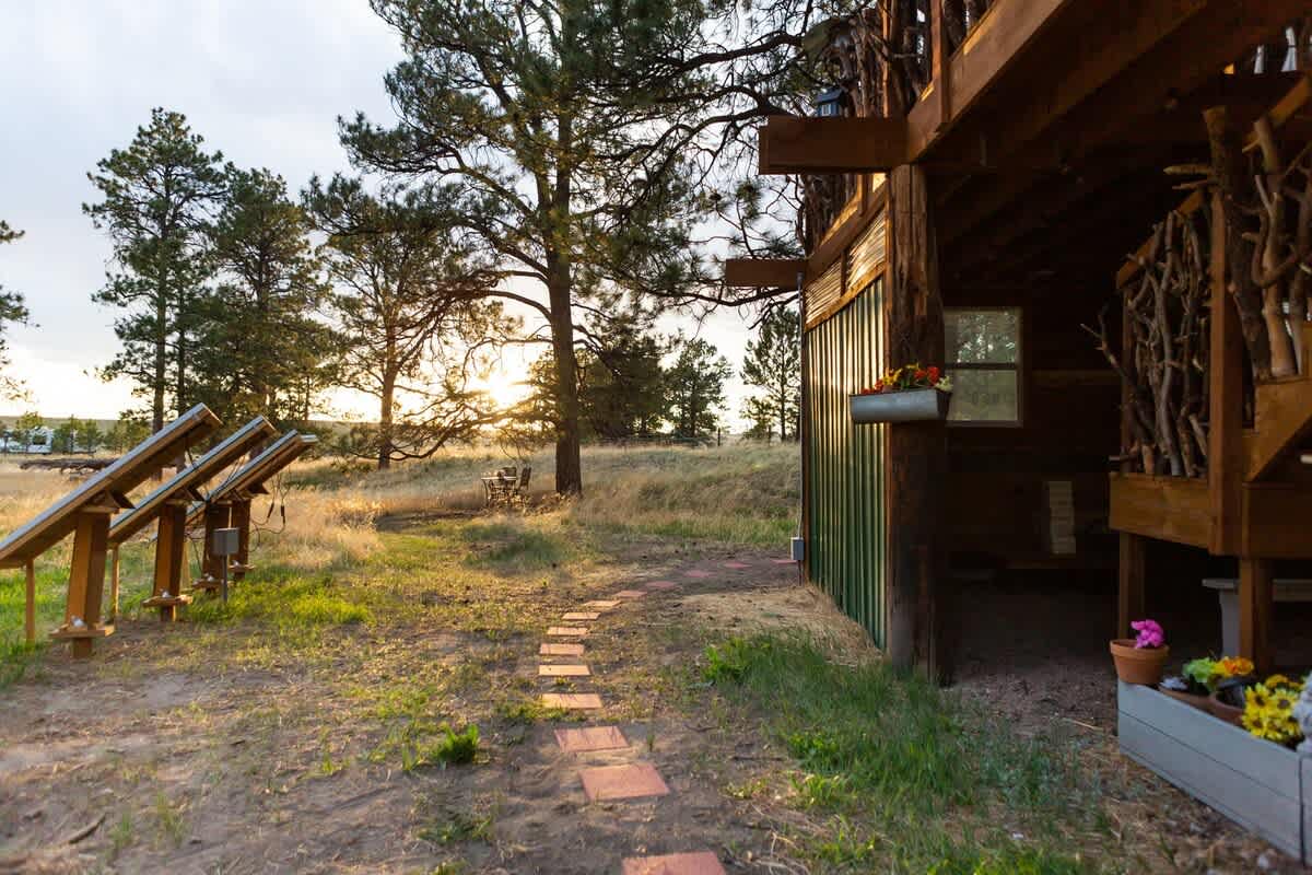 Nestled at an impressive elevation of 6,476 feet above sea level, this enchanting retreat is situated on an expansive 80-acre horse ranch in the heart of Elizabeth, Colorado, renowned for hosting the PCRA Rodeo, the Elizabeth Stampede, since 1966. This captivating escape, lovingly crafted by hand over four years with dedication and the help of cherished friends, is a testament to passion and perseverance. Treehouse Magic is uniquely built around PAL, a majestic Ponderosa Pine Tree, allowing it the freedom to grow and sway gracefully in the breeze. Every aspect of this space exudes magic! The main house offers 300 square feet of cozy living space, complemented by an additional 1,100 square feet of deck area, 200 square feet of covered space, called the gnome room, which closes with a sliding barn door and equipped with a heat source, providing a versatile alternative space.