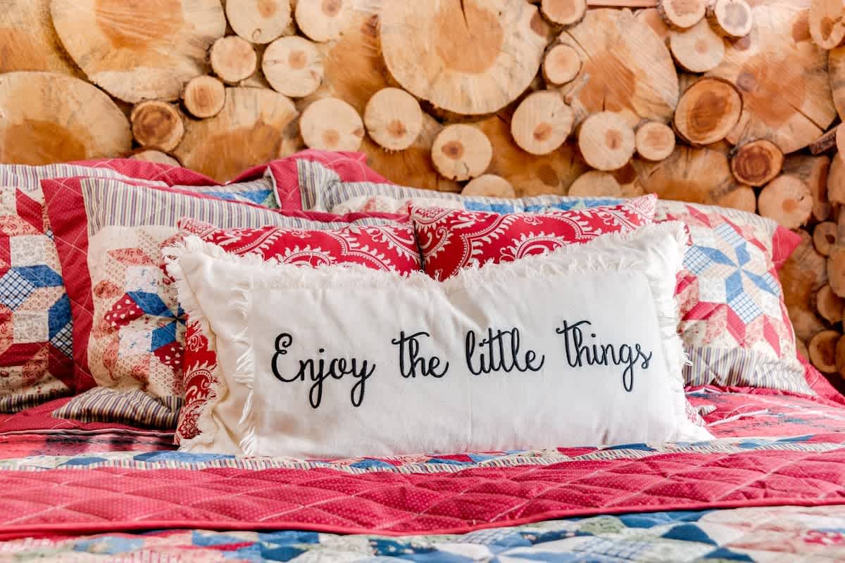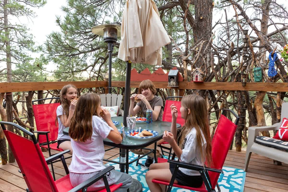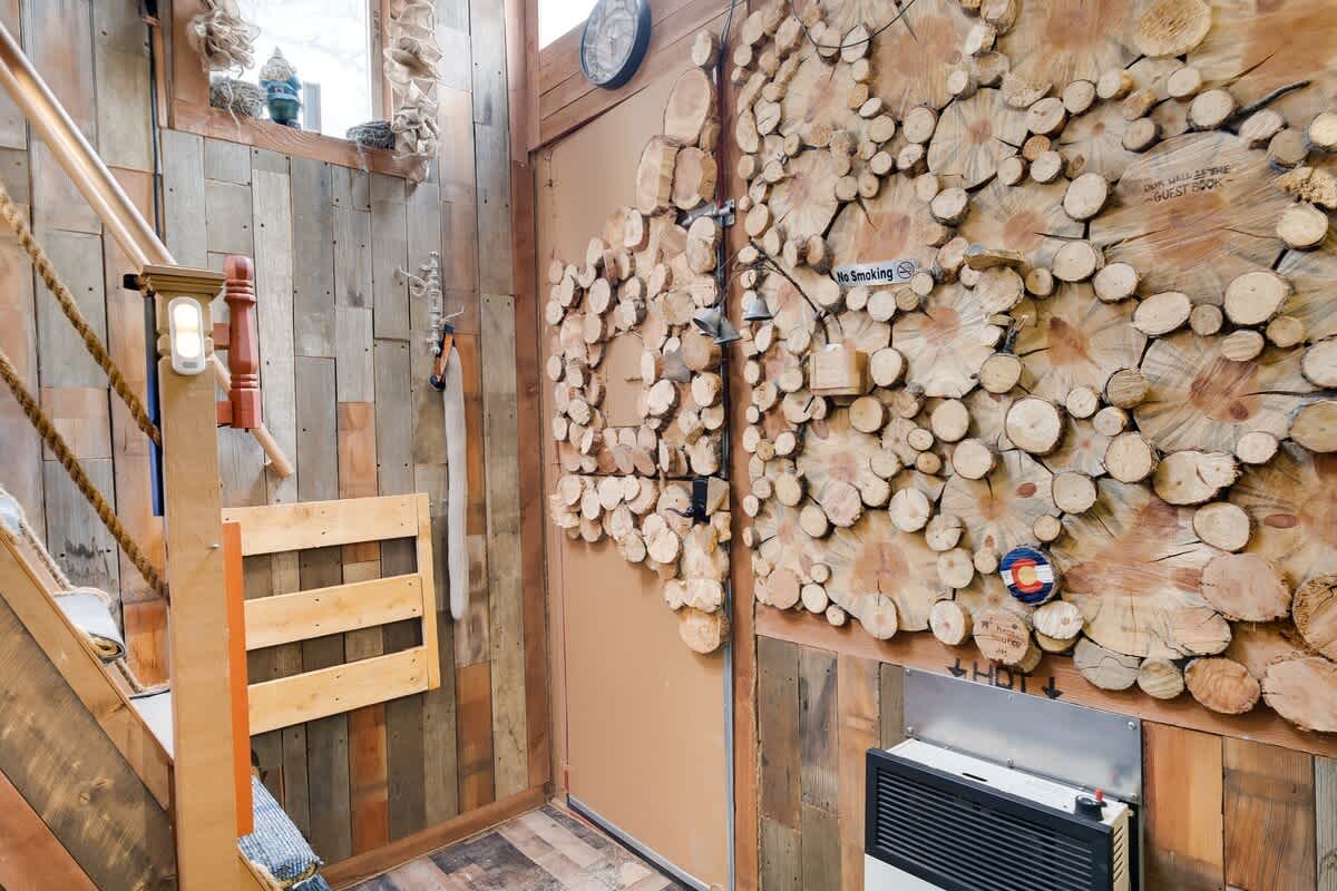 Welcome to the outdoor deck spaces. On the East side, relax by a propane fire pit with four rocking chairs, and enjoy an outdoor kitchen complete with a pellet grill, smoker, and propane griddle. For those who prefer traditional charcoal cooking, a grill and charcoal are available upon request. On the West side, you'll find a table with a 3-point umbrella, a hanging hammock, and the Gnome Room! This versatile indoor/outdoor space includes a couch, a CordaRoy bean bag (which converts into a bed topper for the couch), a rolling table, pop-up tent, cots, a movie screen, and a smart Roku projector for streaming movies. This space has a propane heater, but it NOT insulated or acceptable for sleeping during Winter months
