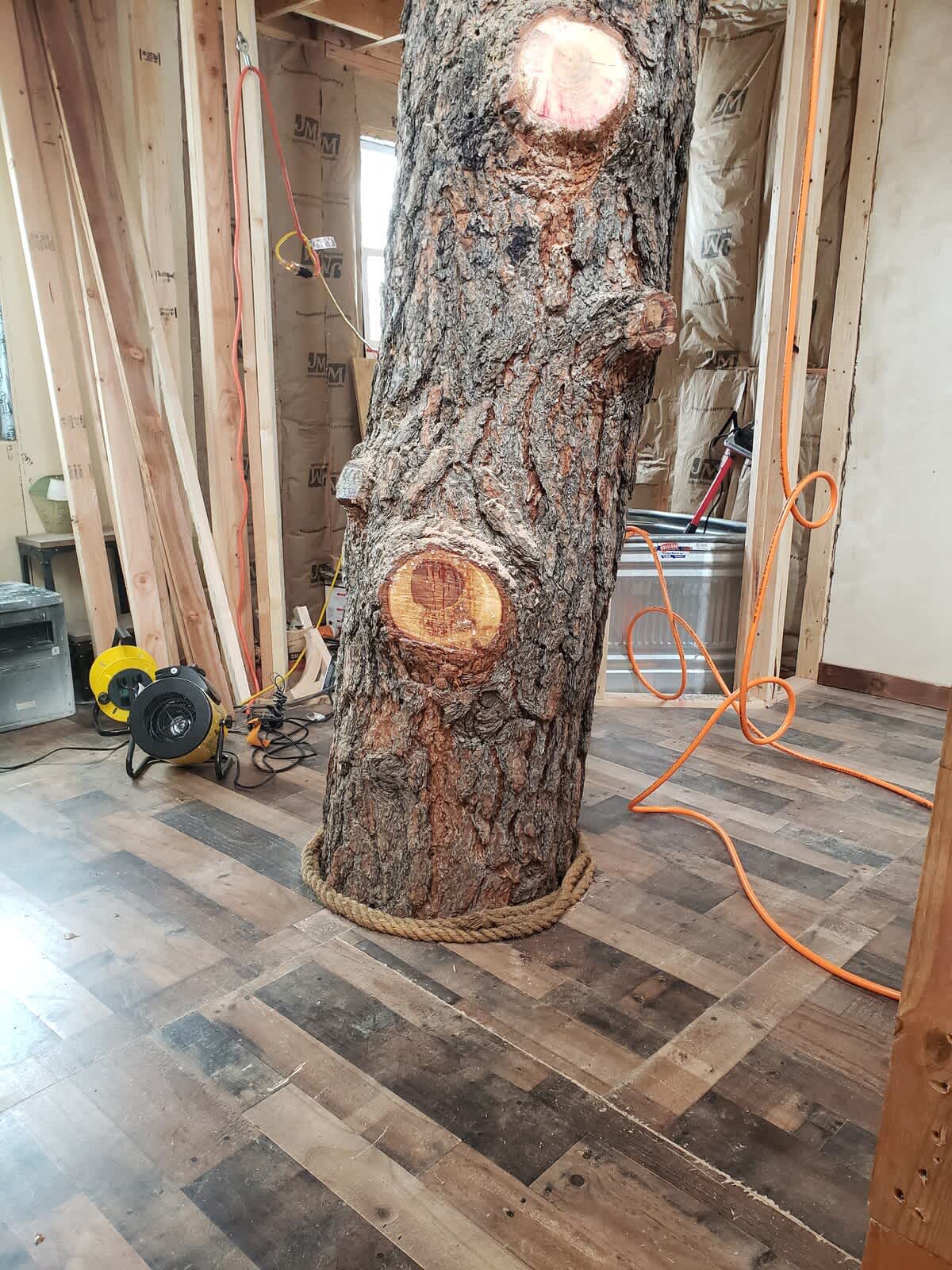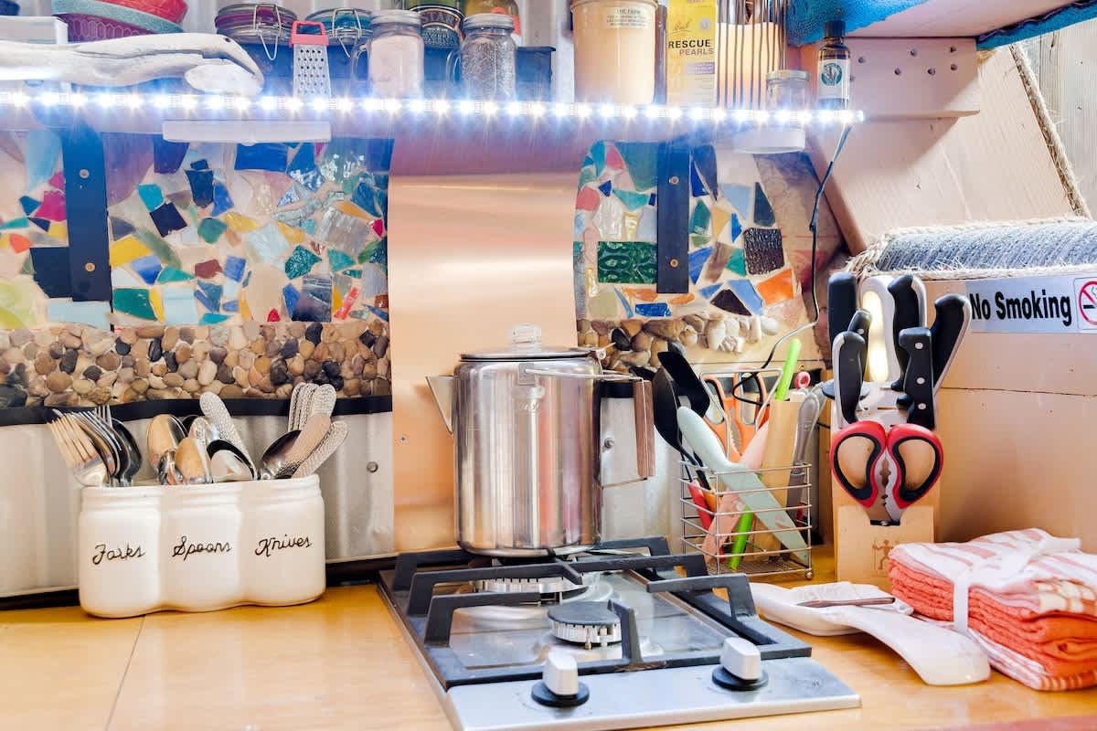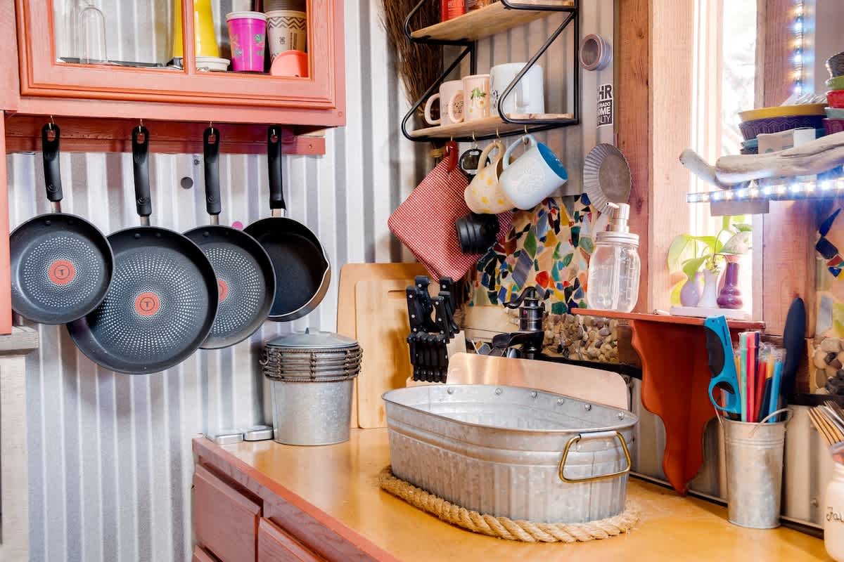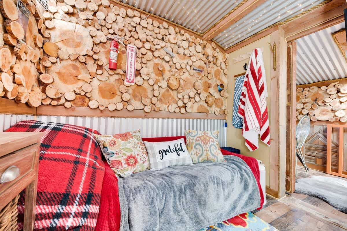 Entering the treehouse, you will be transported to another realm! Pause at the door to admire the lush green grass and gaze up at the treehouse within the treehouse. Magical Gnomes, hand-painted in whimsical worlds, watch over the treehouse and its guests, spreading their enchanting love. The main section of the treehouse features a gathering room with a smart Roku TV and PS4 game station. The couch can be converted into an additional sleeping space. The kitchen is equipped with a 2-burner propane stove, a small refrigerator, and all the essentials for meal preparation. Enjoy complimentary coffee from Dancing Jaguar Coffee, a local treasure from four-generation coffee farmers in Honduras, packaged and labeled right here in Elizabeth. Refresh in the horse trough shower with a rain faucet and take a moment to "ponder" while using the composting toilet and squatty potty. Ascend the steep staircase to the drawing-room, where you can pen a letter or explore the many activity and drawing books. Notice the "mouse house" at your feet and the industrious worker ants that played a vital role in our success! Through the barn door, you'll find the private sleeping quarters, featuring a 14" gel foam full mattress for a restful night's sleep. There's also a couch that converts into another full bed.