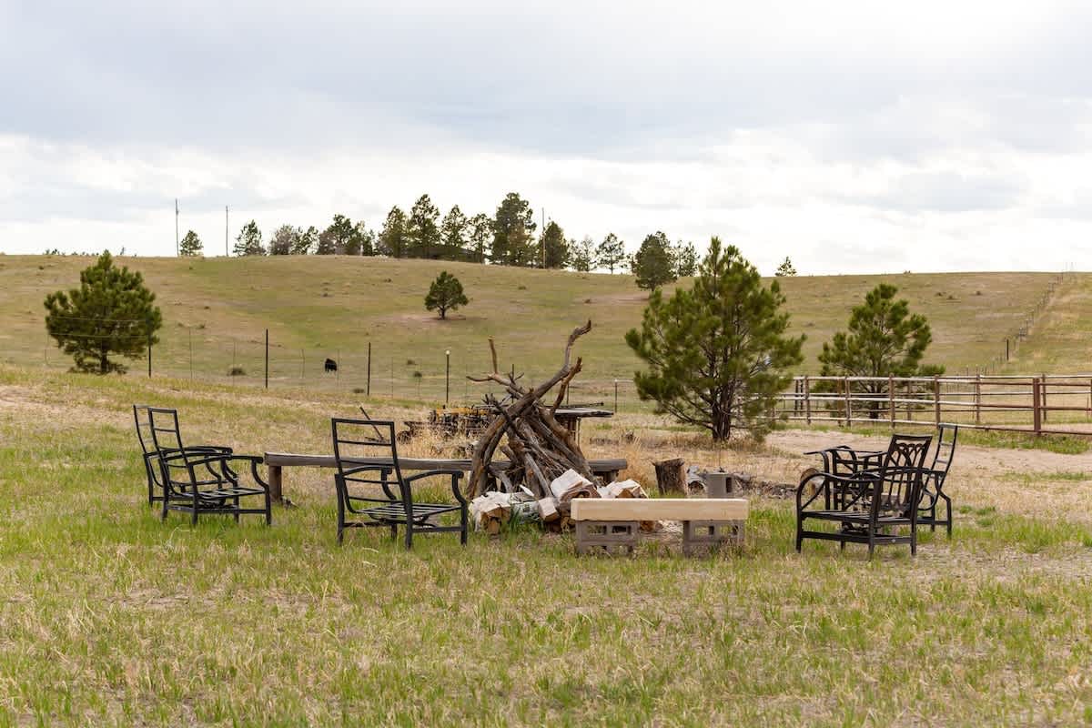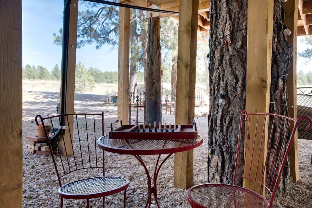 Across the drive to the East, enjoy the outdoor horseshoes and corn hole area, a tire swing, and another dining and relaxation space. If you're bringing your four-legged companion, there's a 3/4 acre fenced-in yard where they can roam off-leash in your company. Engage in a game of glow-in-the-dark tetherball! Two more hammocks, a table and chairs, and a delightful firepit await you. For those times when you need to leave your furry friend for a short while, we offer a large covered kennel.