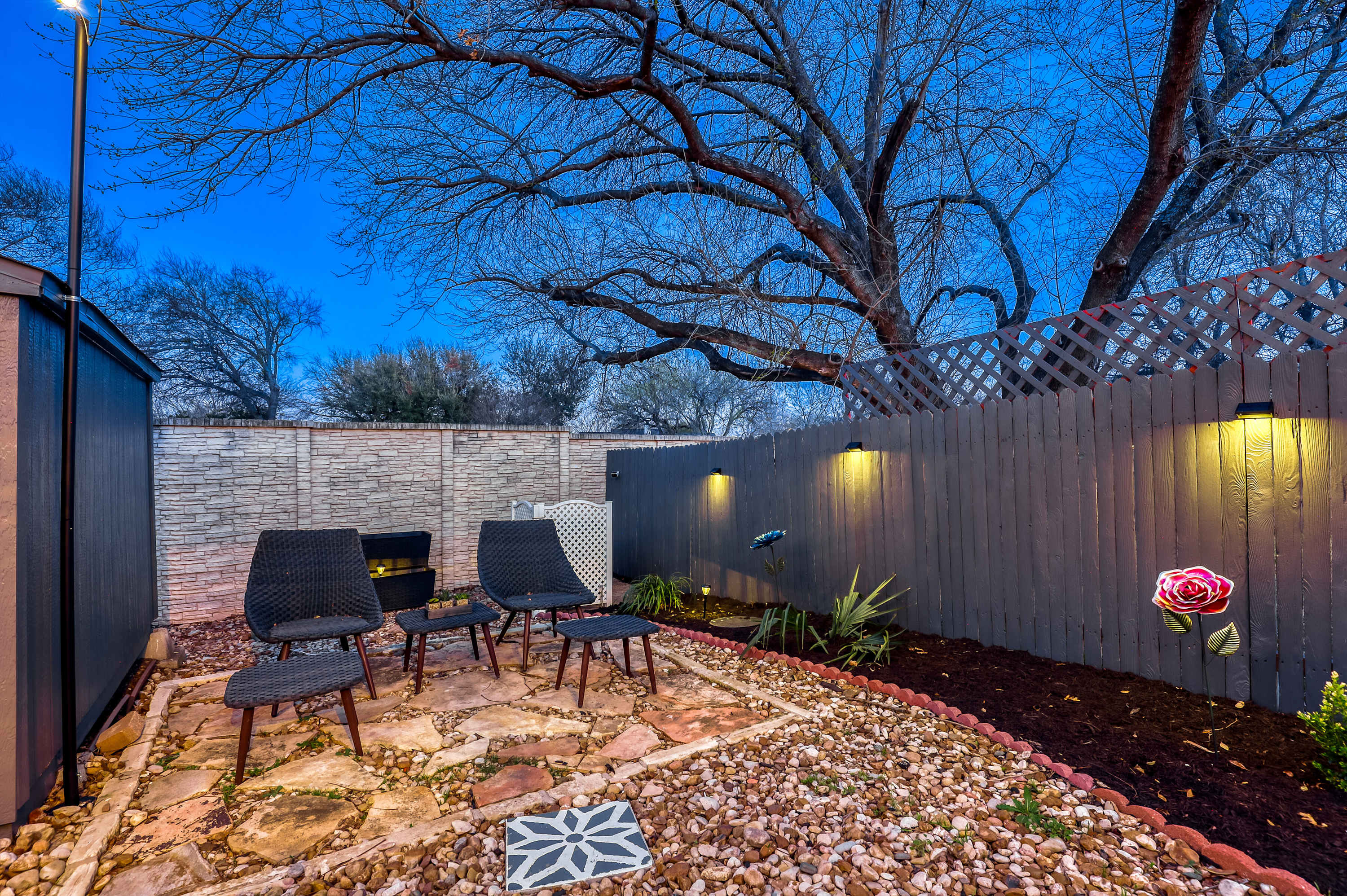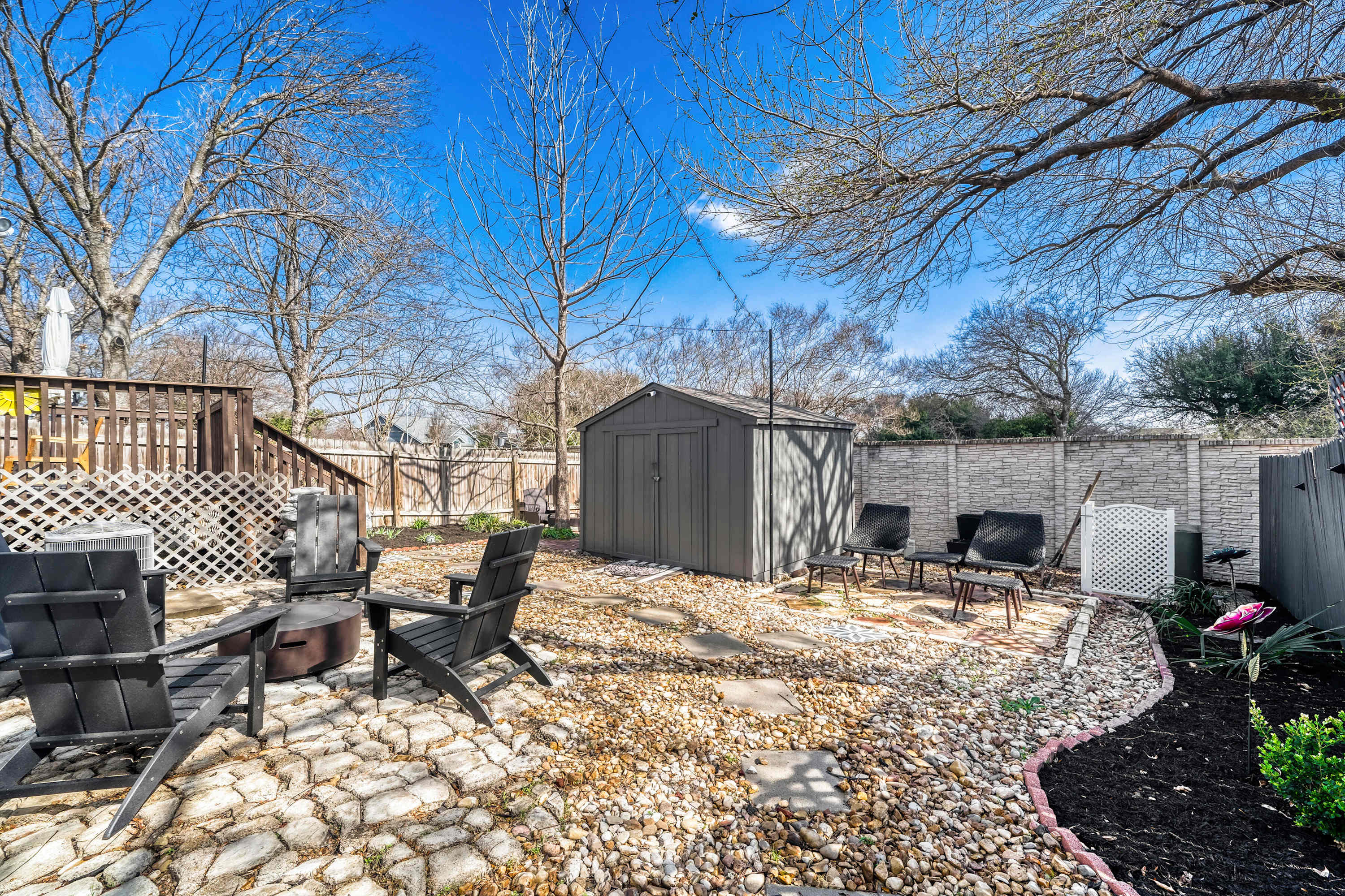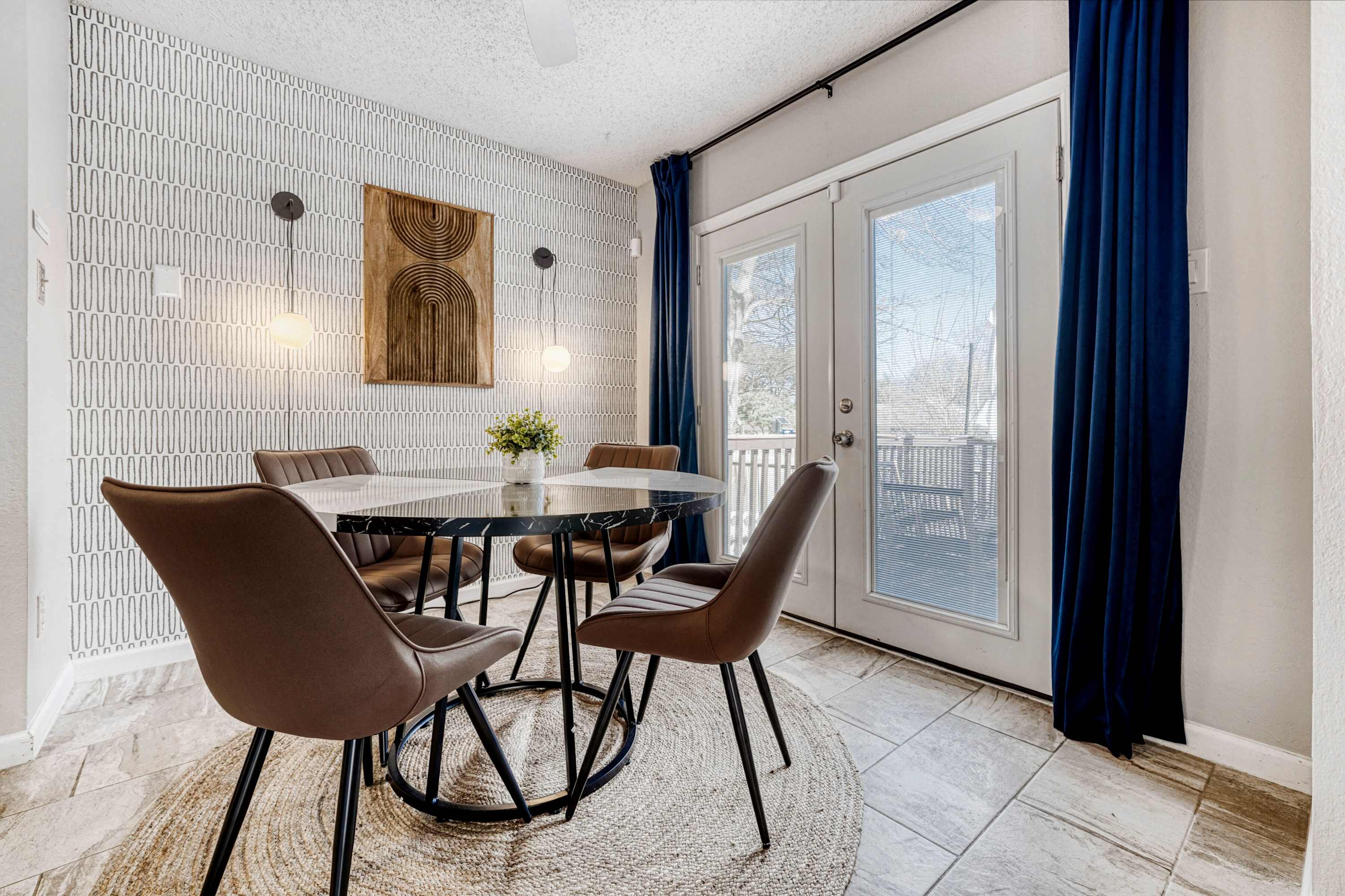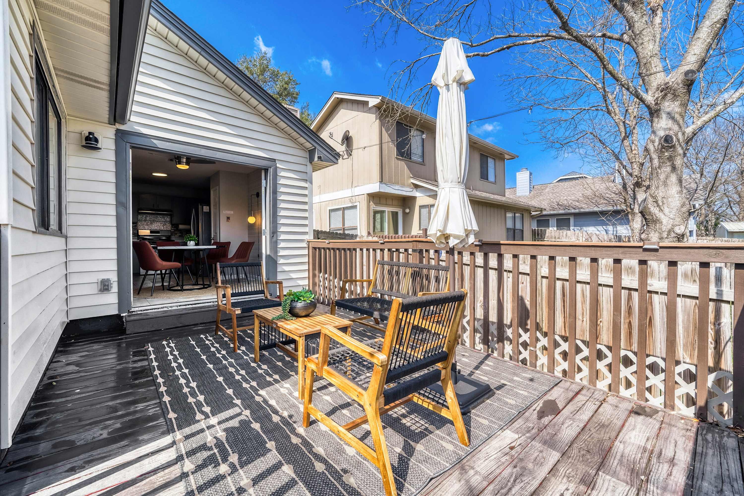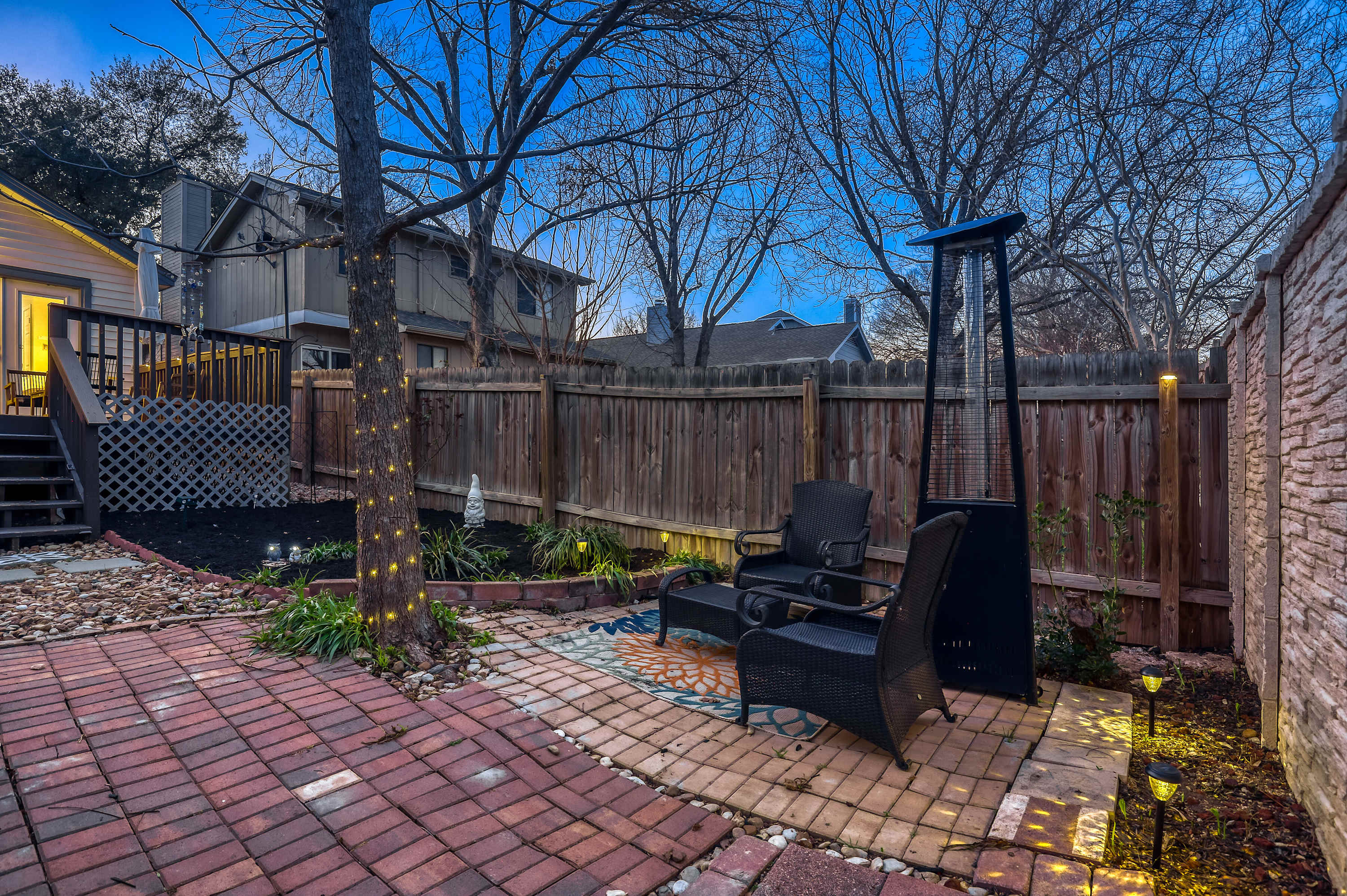Step through French doors to your private fenced backyard with a wooden deck. Ideal for morning coffee, evening cocktails, or unwinding under the Texas stars.