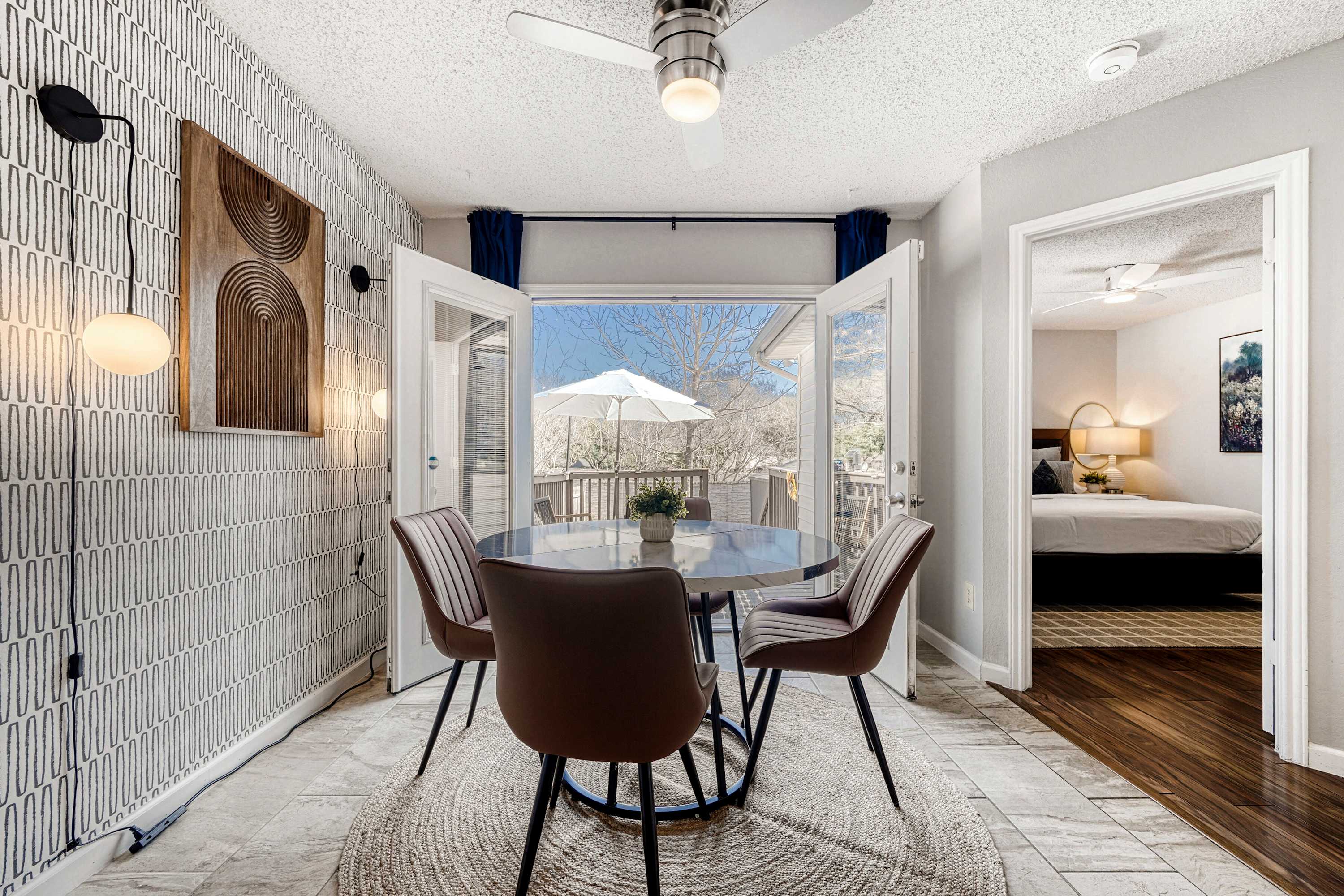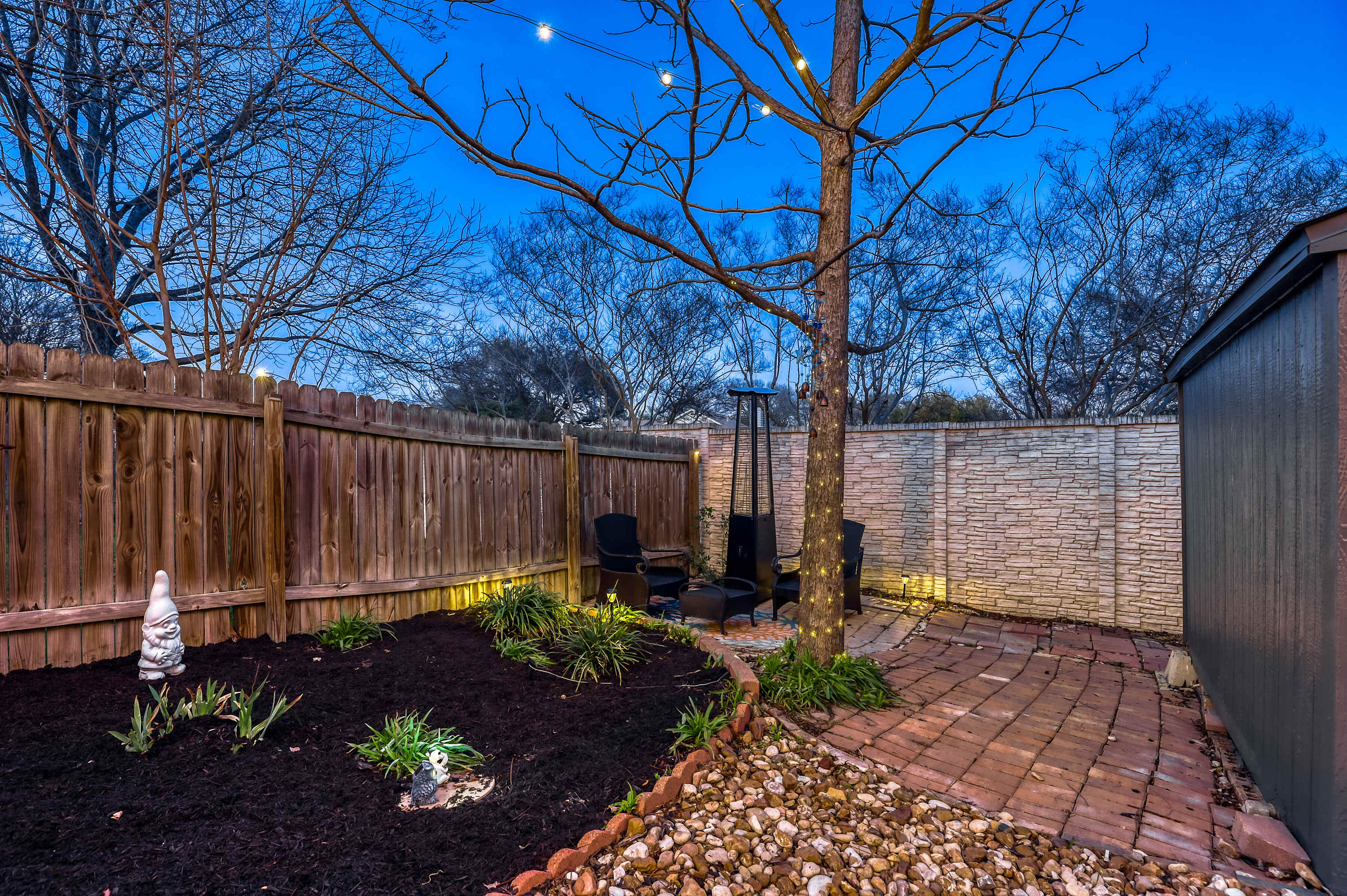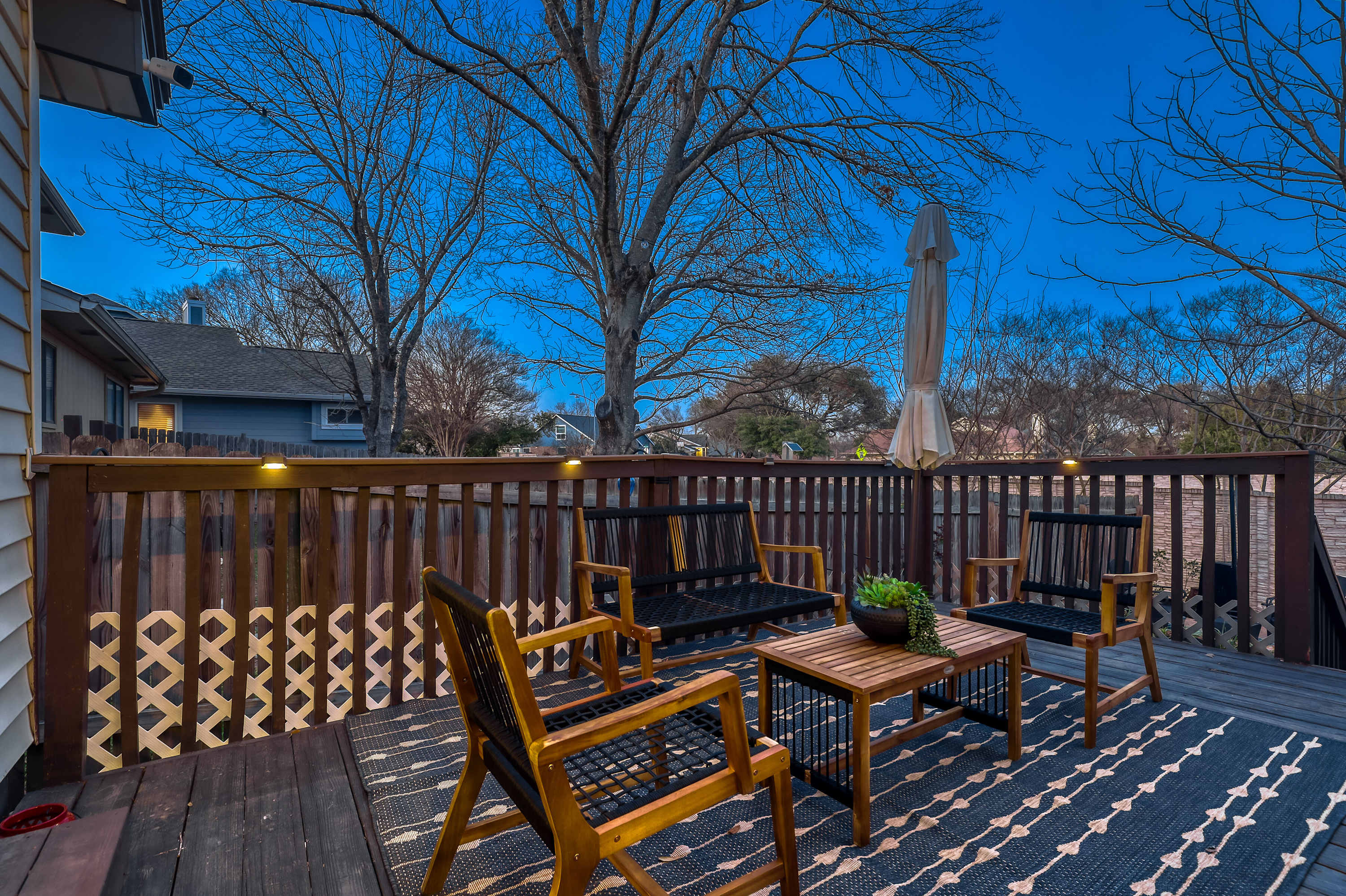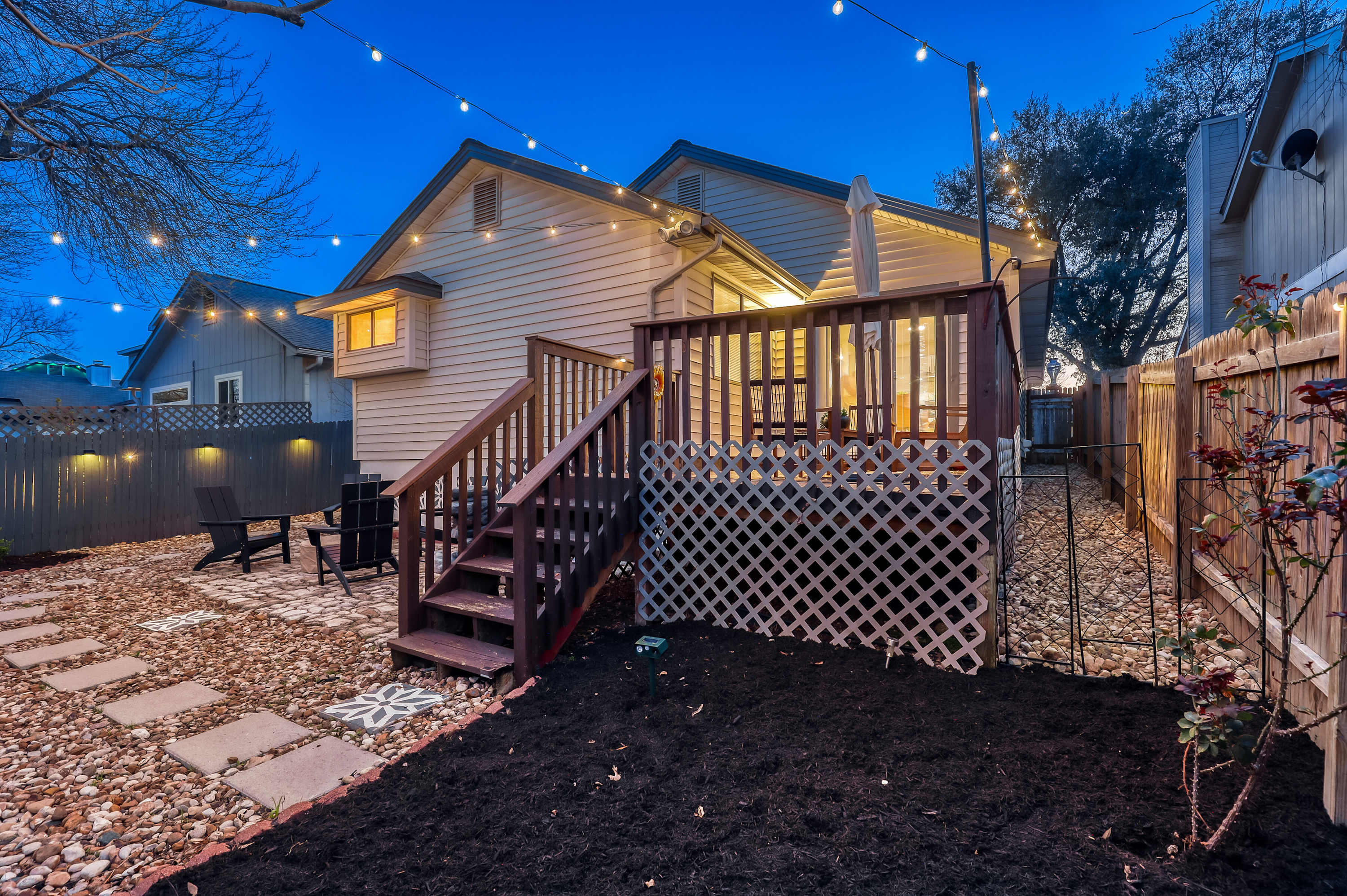 Step through French doors to your private fenced backyard with a wooden deck. Ideal for morning coffee, evening cocktails, or unwinding under the Texas stars.