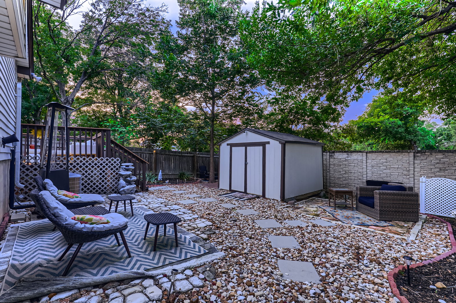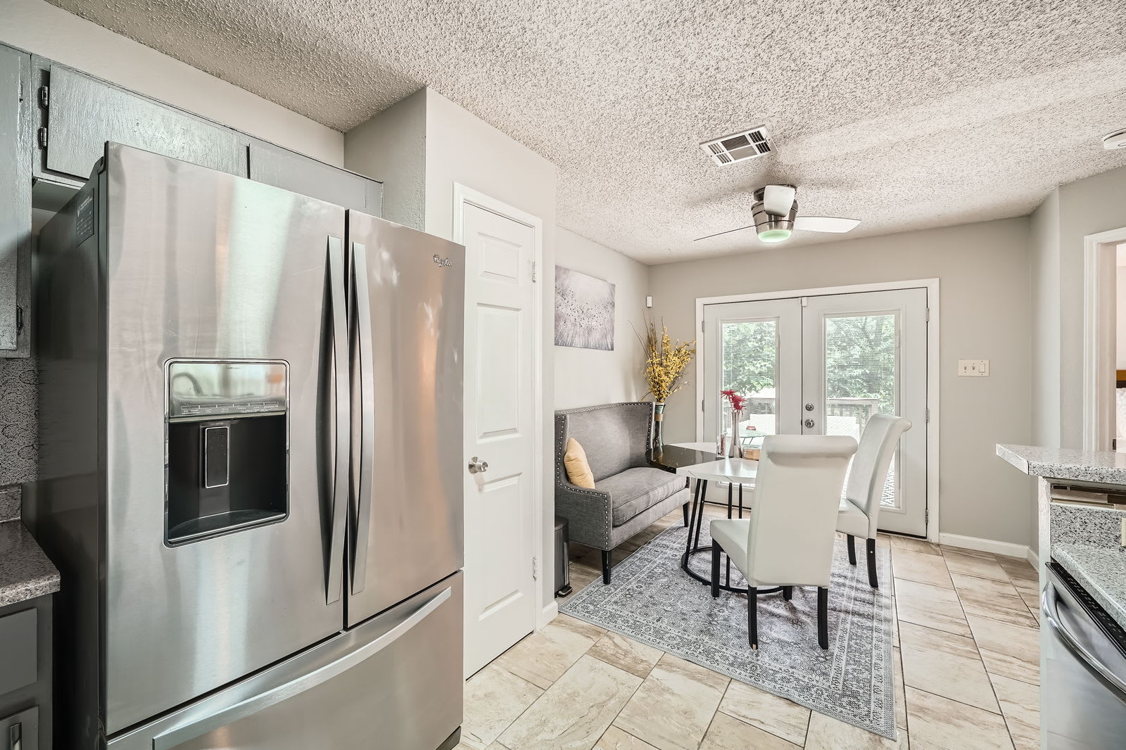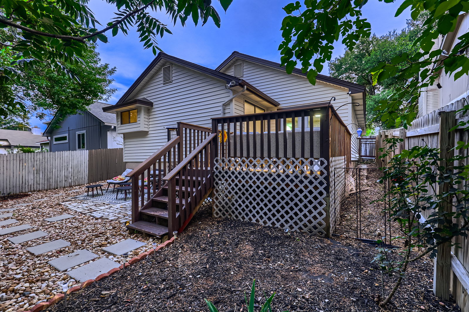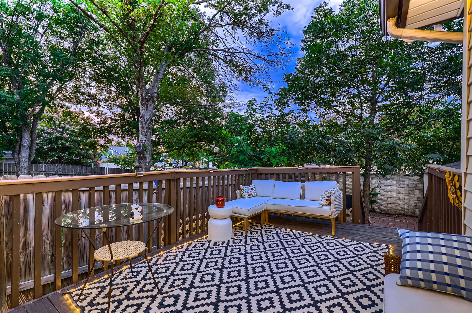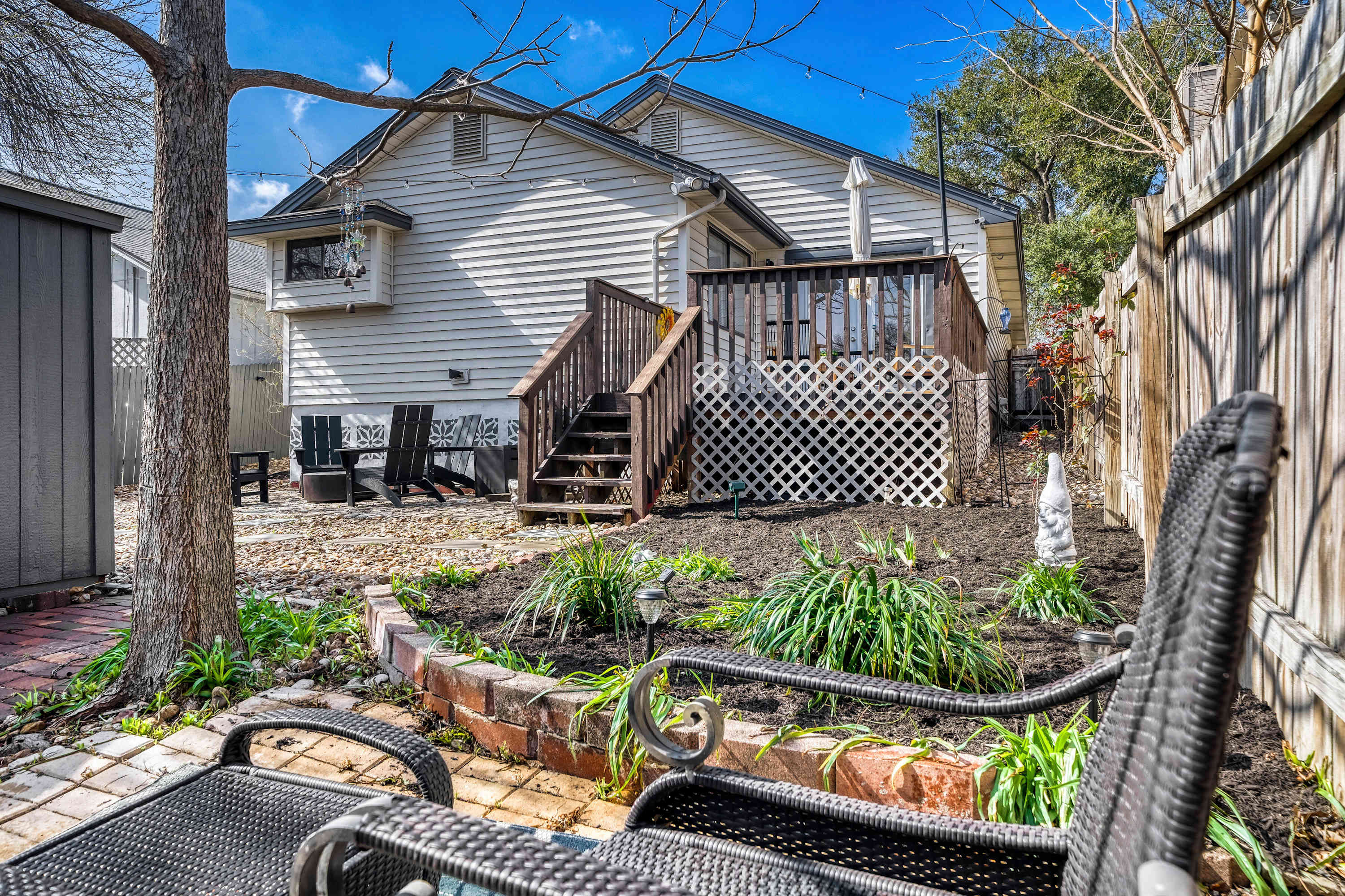 Step through French doors to your private fenced backyard with a wooden deck. Ideal for morning coffee, evening cocktails, or unwinding under the Texas stars.