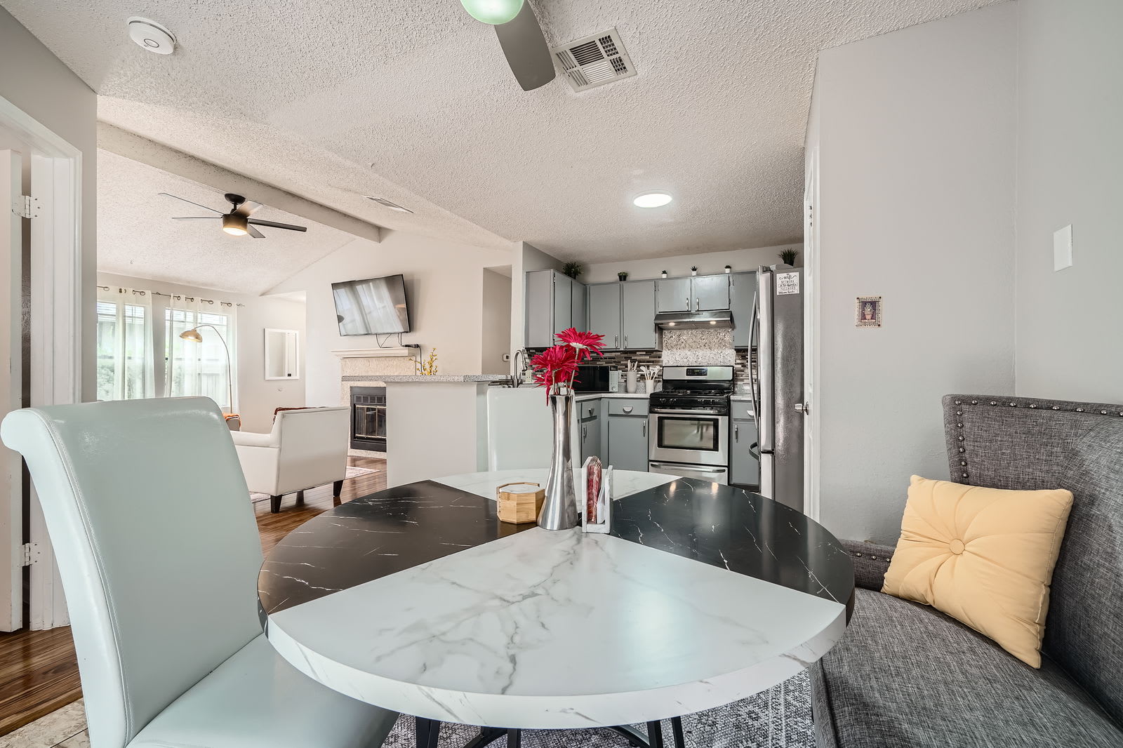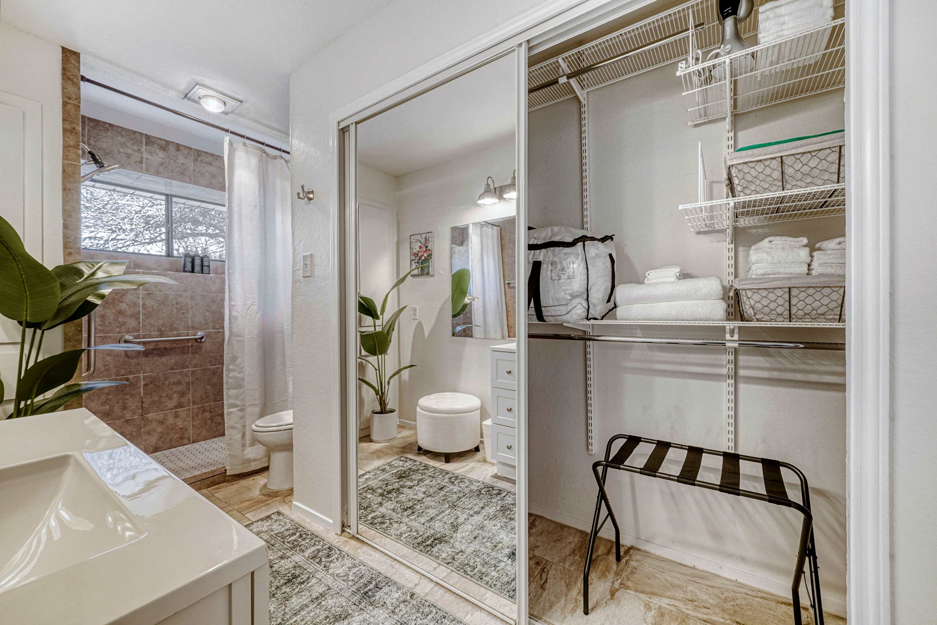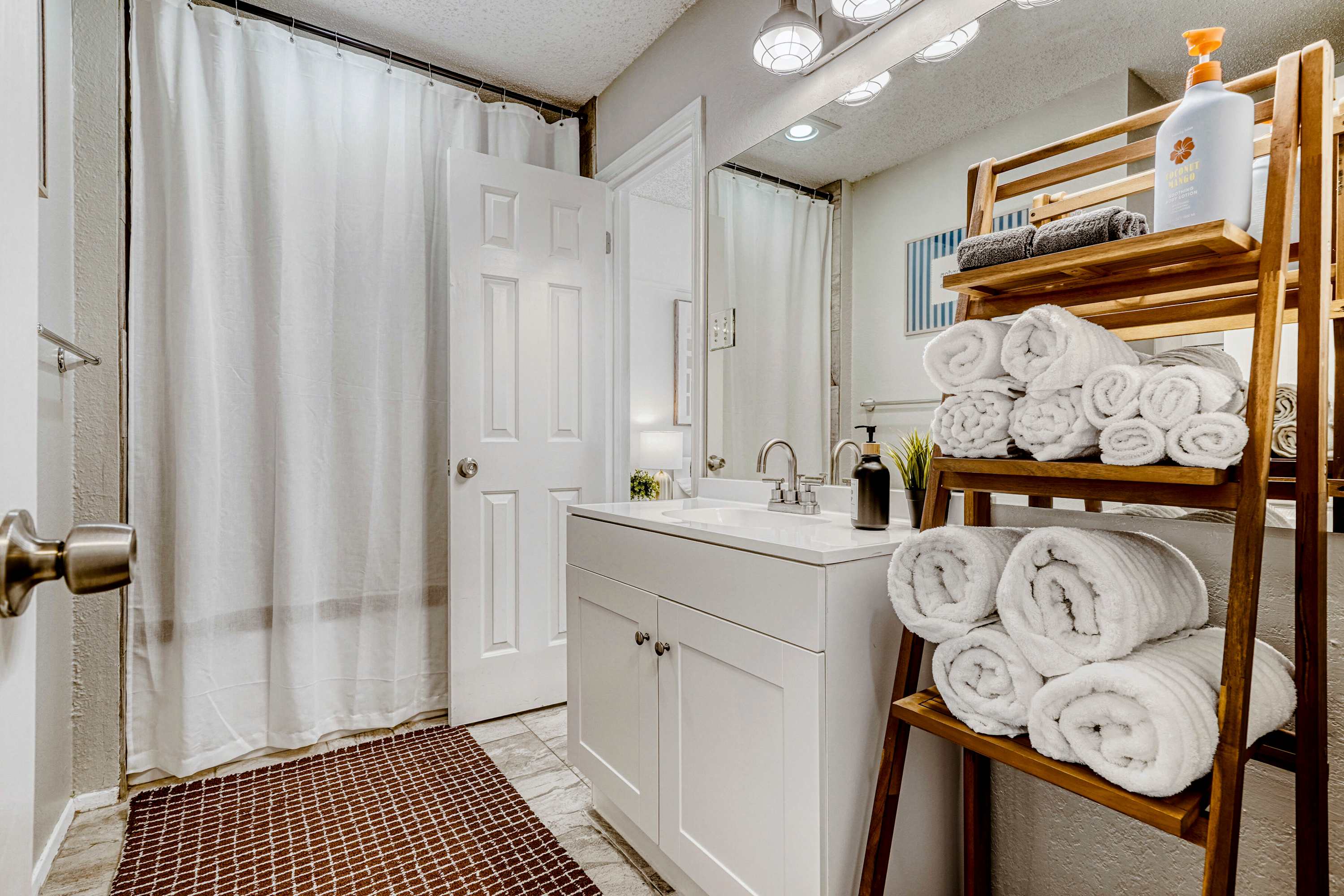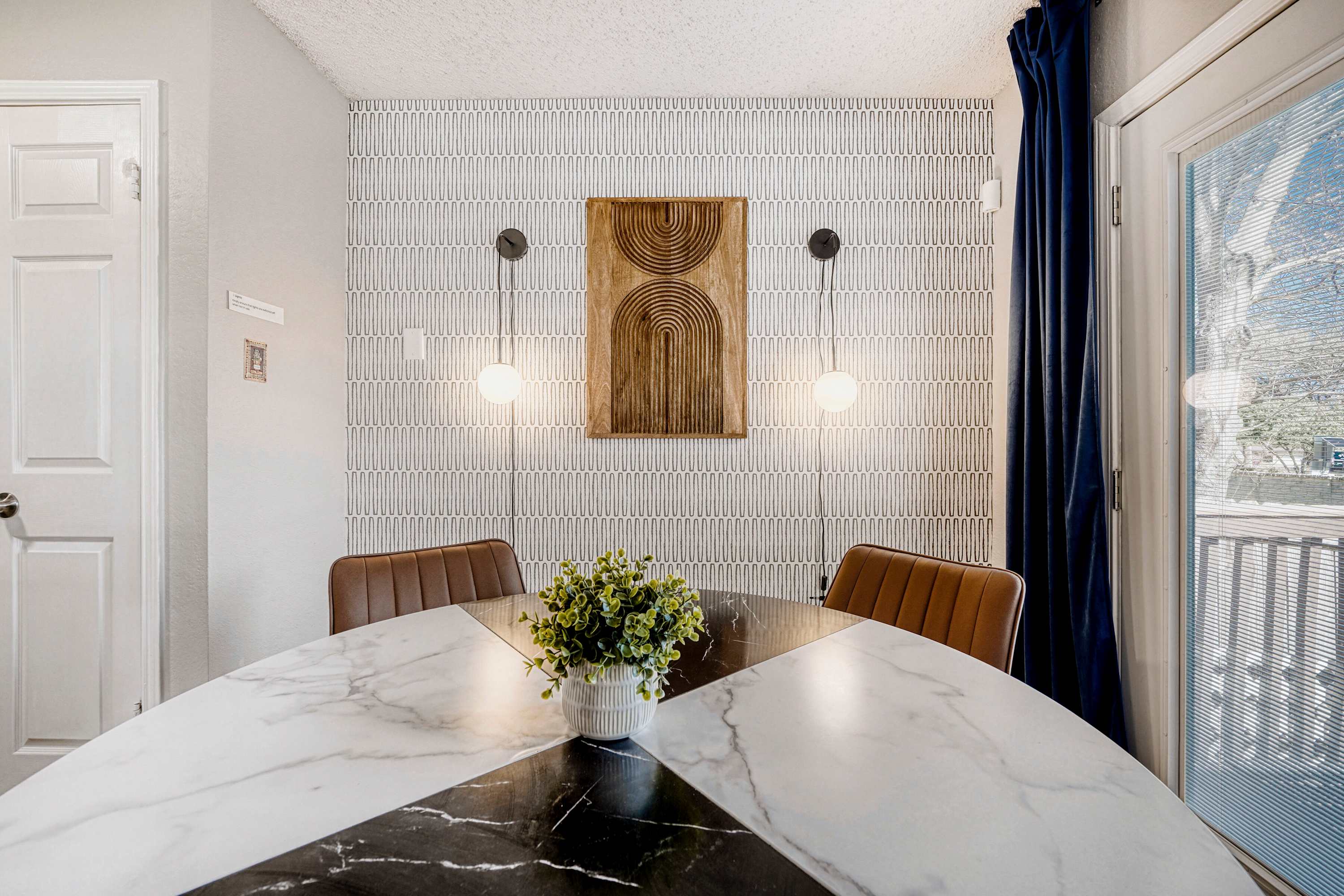 The sparkling clean remodeled kitchen features stainless steel appliances, ample cabinet space, sleek countertops and a breakfast bar. Perfect for cooking full meals, preparing game-day snacks before Q2 Stadium, or enjoying breakfast before a fun day at The Domain, Kalahari, or Typhoon Texas Waterpark.