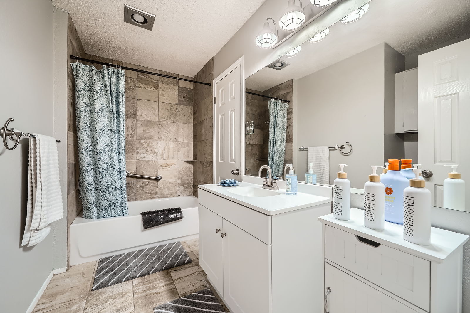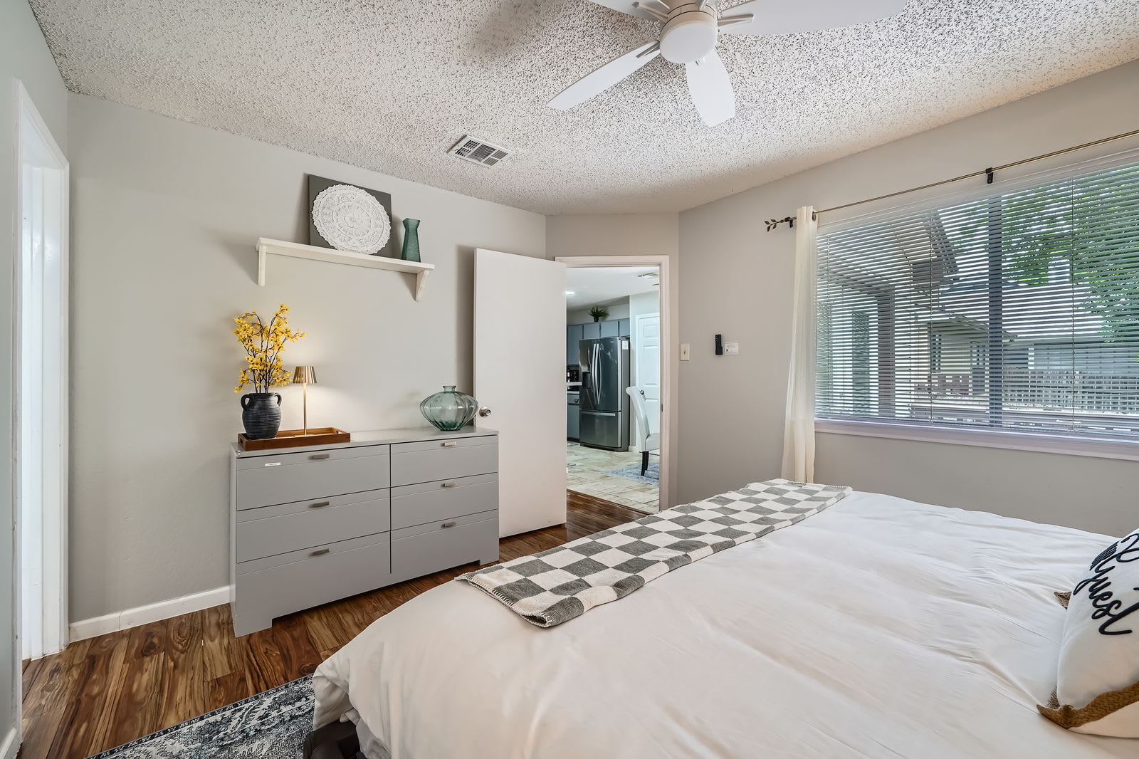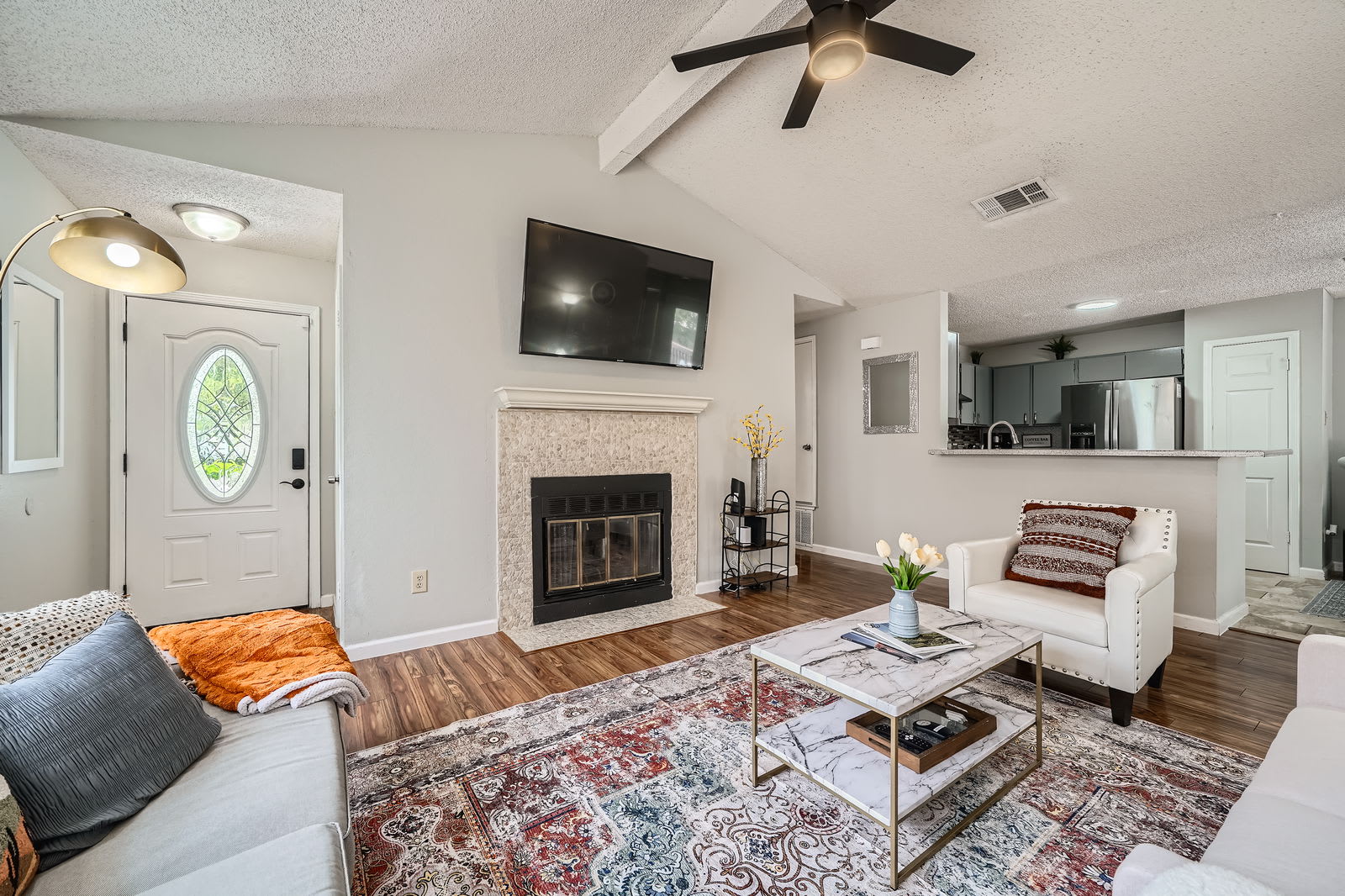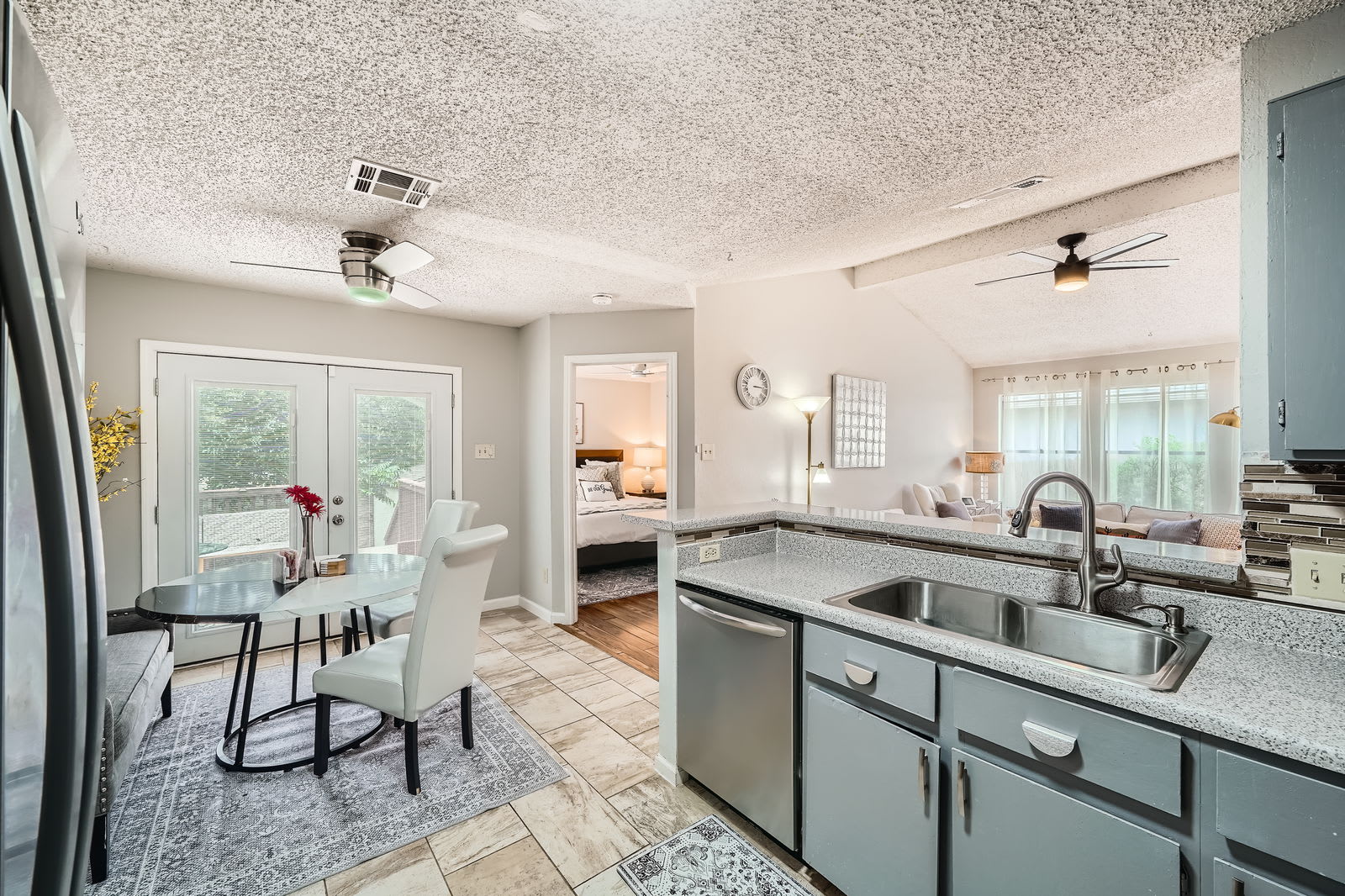 The sparkling clean remodeled kitchen features stainless steel appliances, ample cabinet space, sleek countertops and a breakfast bar. Perfect for cooking full meals, preparing game-day snacks before Q2 Stadium, or enjoying breakfast before a fun day at The Domain, Kalahari, or Typhoon Texas Waterpark.