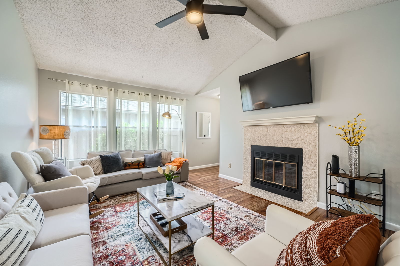 Stay in comfort at this remodeled 2BR/2BA North Austin home with high ceilings, an open layout, and a private backyard deck. Perfect for families, couples, or business travelers, it features a cozy fireplace, stainless appliances, and modern finishes. The primary suite includes a walk-in shower, while the second bedroom has direct bath access. Just minutes to The Domain, Q2 Stadium, Kalahari Resort, Typhoon Texas, and downtown Austin, with easy access to I-35 and Mopac.