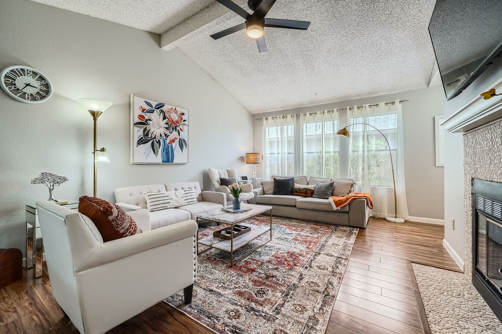 Relax in the open-concept living room featuring soaring ceilings, wood-look vinyl floors, and a warm fireplace. The seamless flow into the dining area makes it easy to host meals, work remotely, or enjoy a quiet night in.