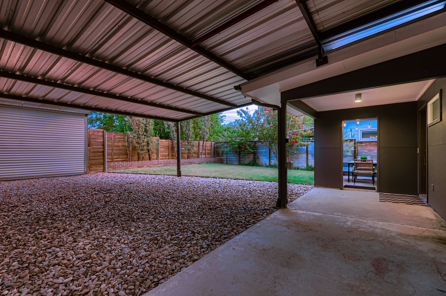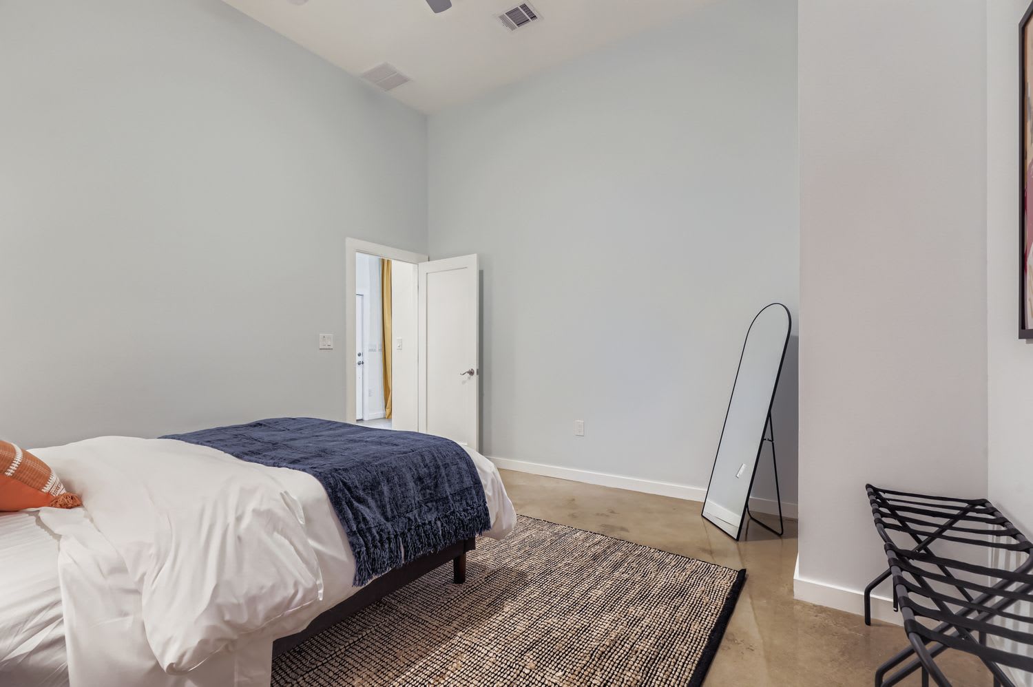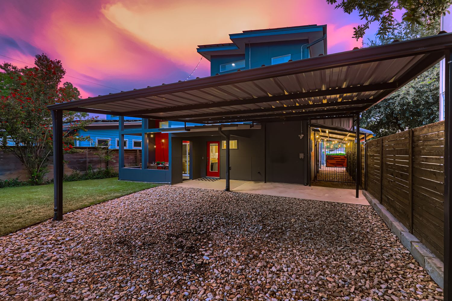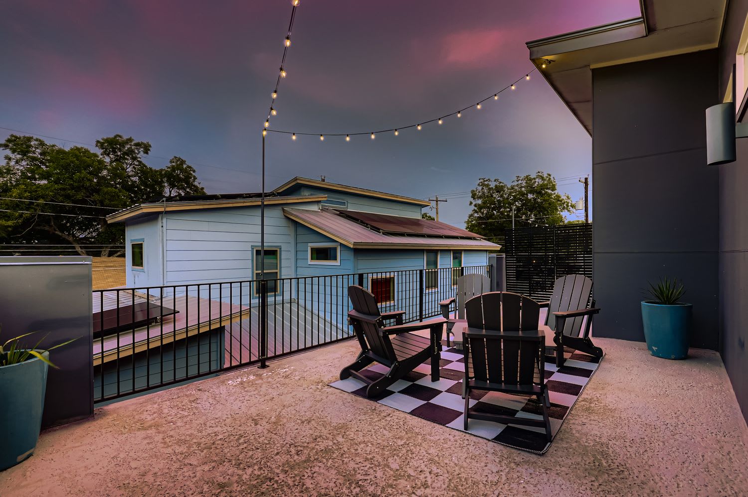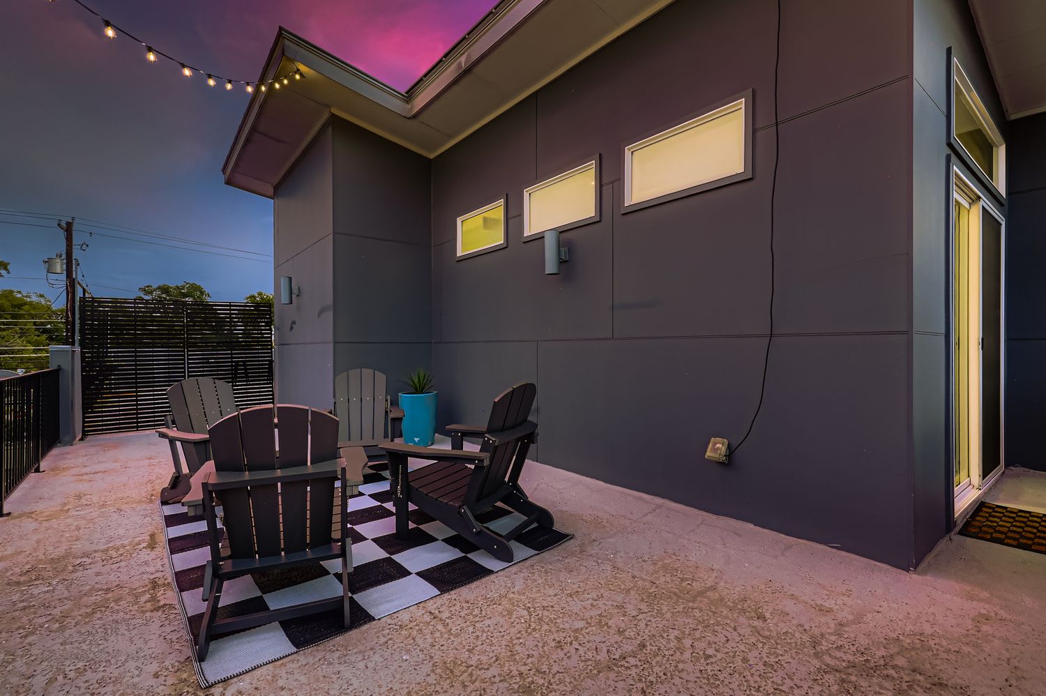 Welcome to our home! Experience bold design and cozy charm in this modern East Austin retreat. This stylish 2BR/2BA home features high ceilings, polished concrete floors, a gourmet kitchen, and plush bedrooms on separate levels for privacy. Outdoor spaces include a string-lit rooftop deck, covered patio, gated yard, and carport. Walk to bars, food trucks, and breweries, or ride minutes to Downtown, Rainey, SoCo, SXSW venues, ACL at Zilker, UT games, Moody Center, and Formula 1 at COTA.