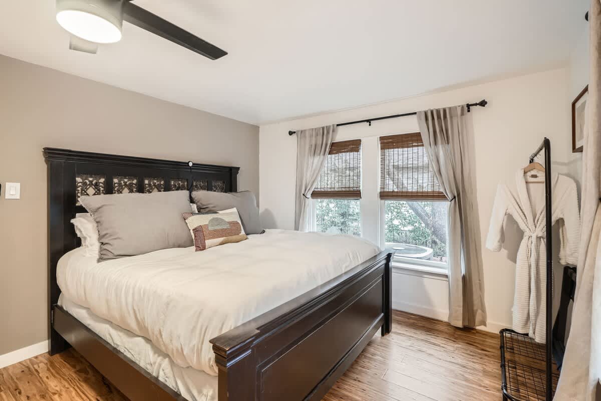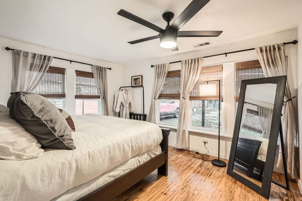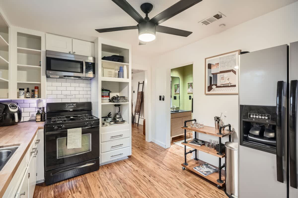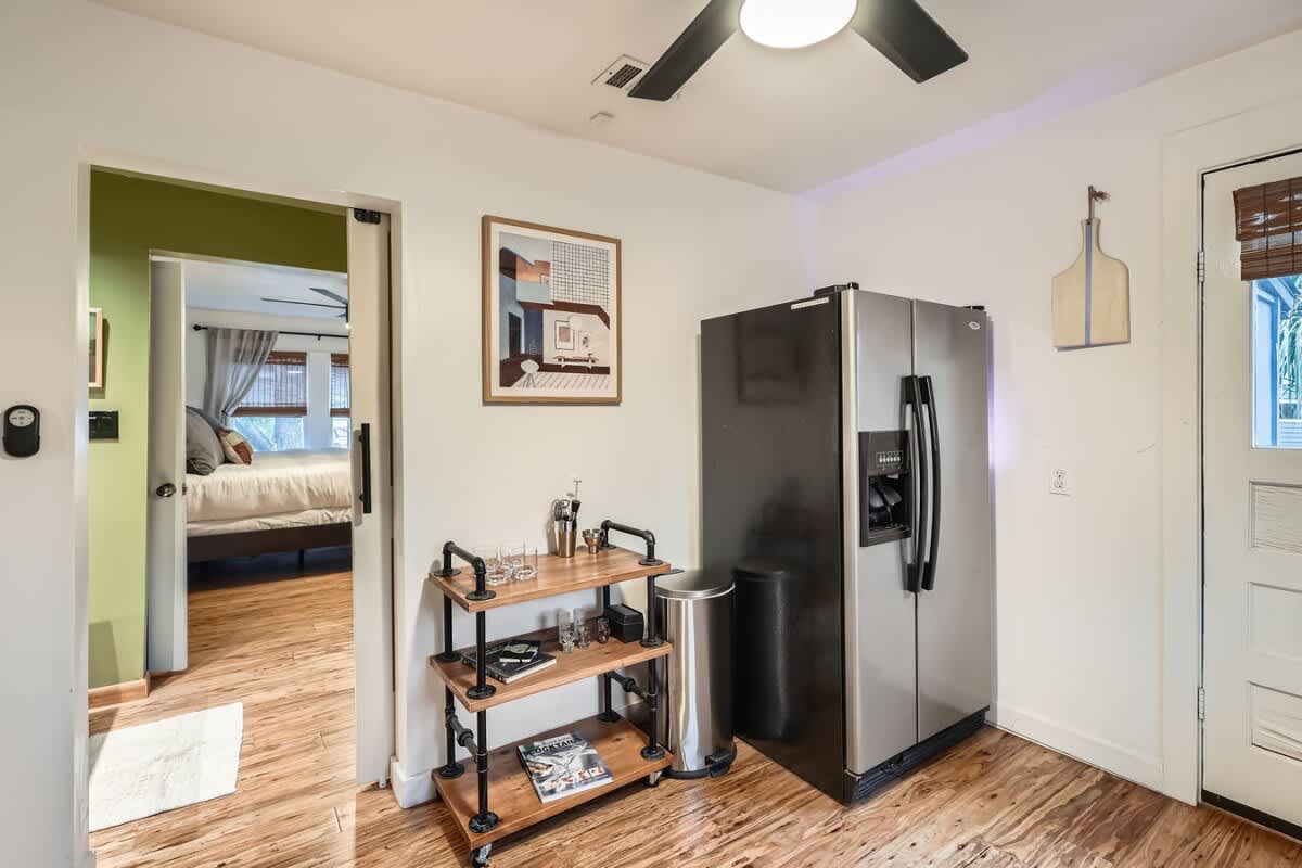 Relax in the fully fenced backyard, perfect for group hangouts, morning coffee, or evening drinks after exploring East Austin. There is also a separate back house available for groups wanting additional space.