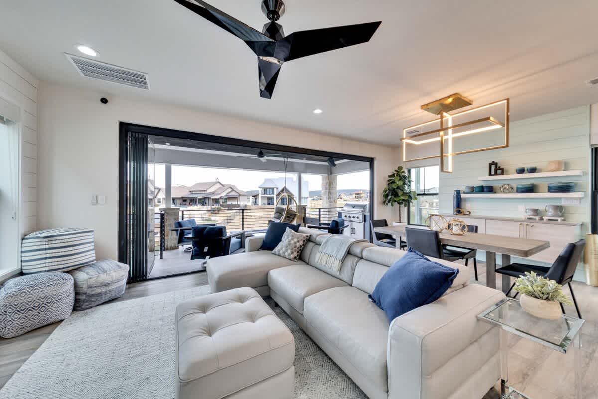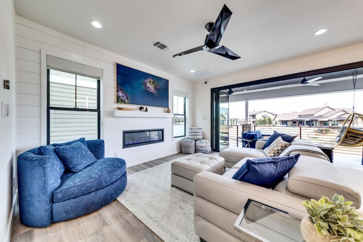 Great Room – Smart TV, electric fireplace, and full-wall glass accordion doors opening to a lake-view balcony. Includes a queen sofa bed.