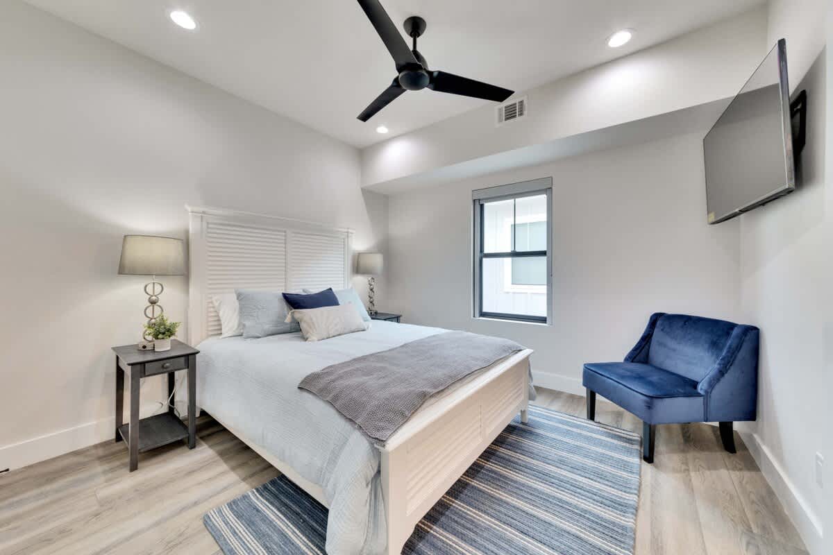Secondary Bedroom 2 – Queen bed, Smart TV, and bench.