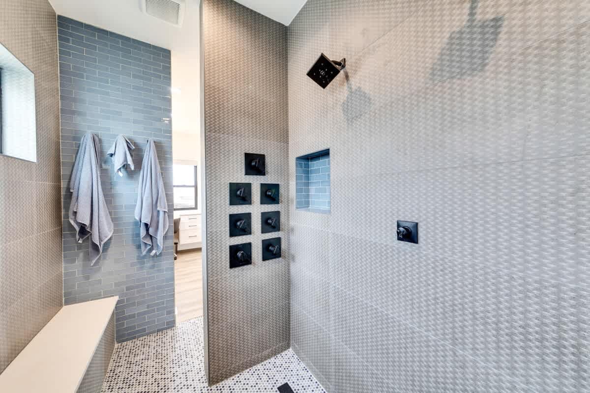Primary Suite – King bed, Smart TV, private balcony, walk-in closet, and spa-like bath with a double walk-in shower, dual vanities, makeup counter, and water closet.