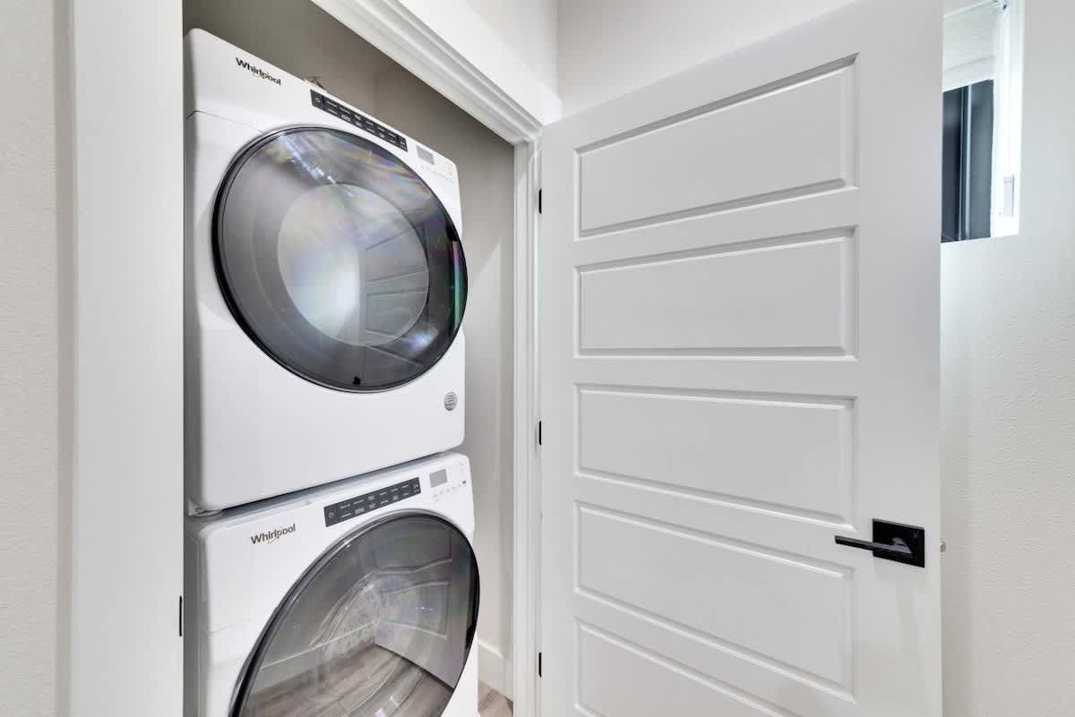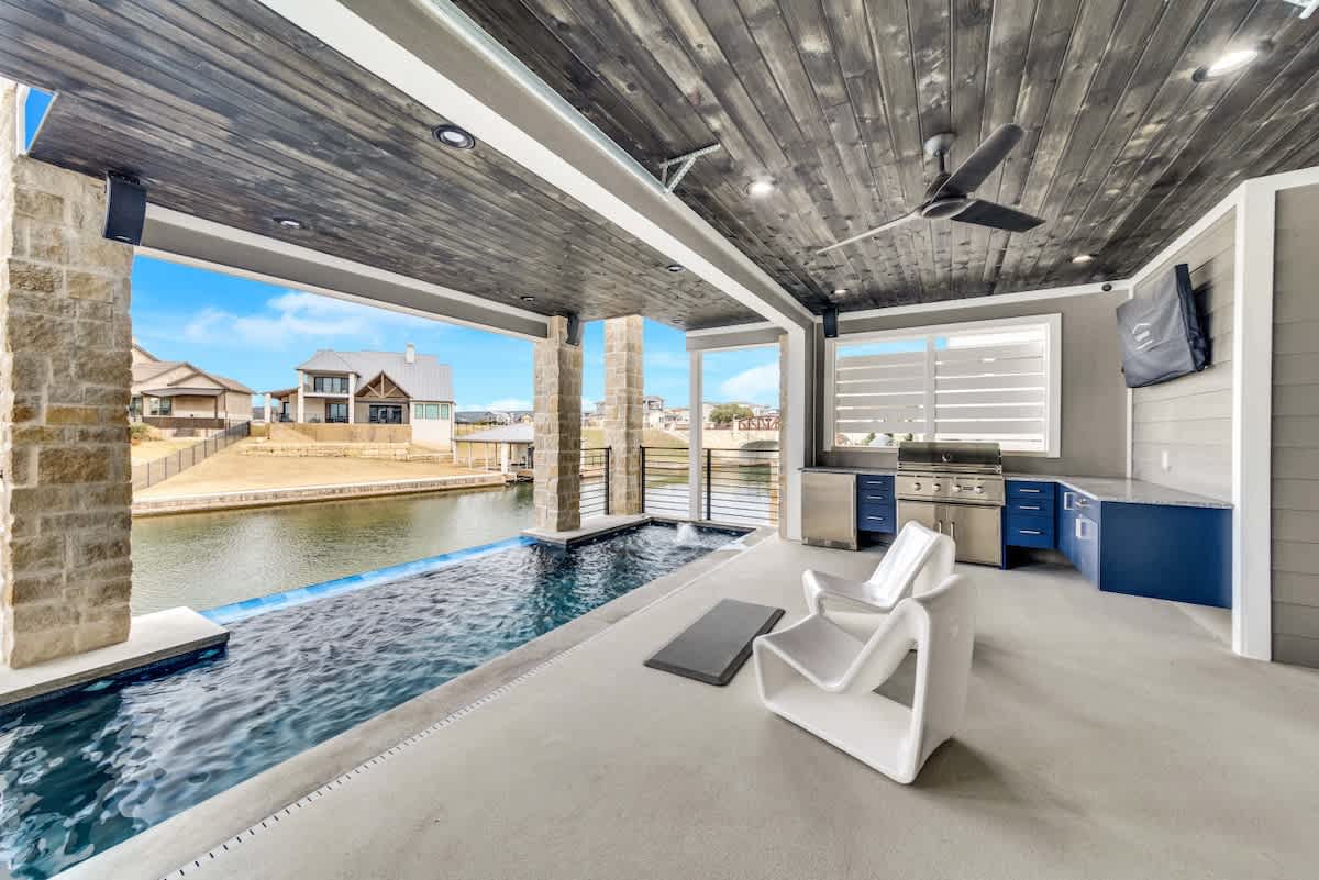 Outdoor Oasis – Private pool deck with gas BBQ, mini fridge, Smart TV, sound system, half bath, and second washer/dryer. Lounge seating, life jackets, and a roll-up garage door for added privacy.