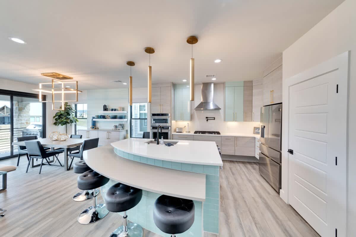 Kitchen & Dining – Fully stocked with modern appliances, a built-in ice maker, and a pantry. The dining table seats 8-10 and flows into the great room.