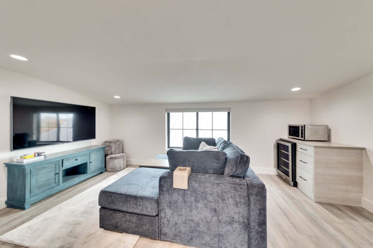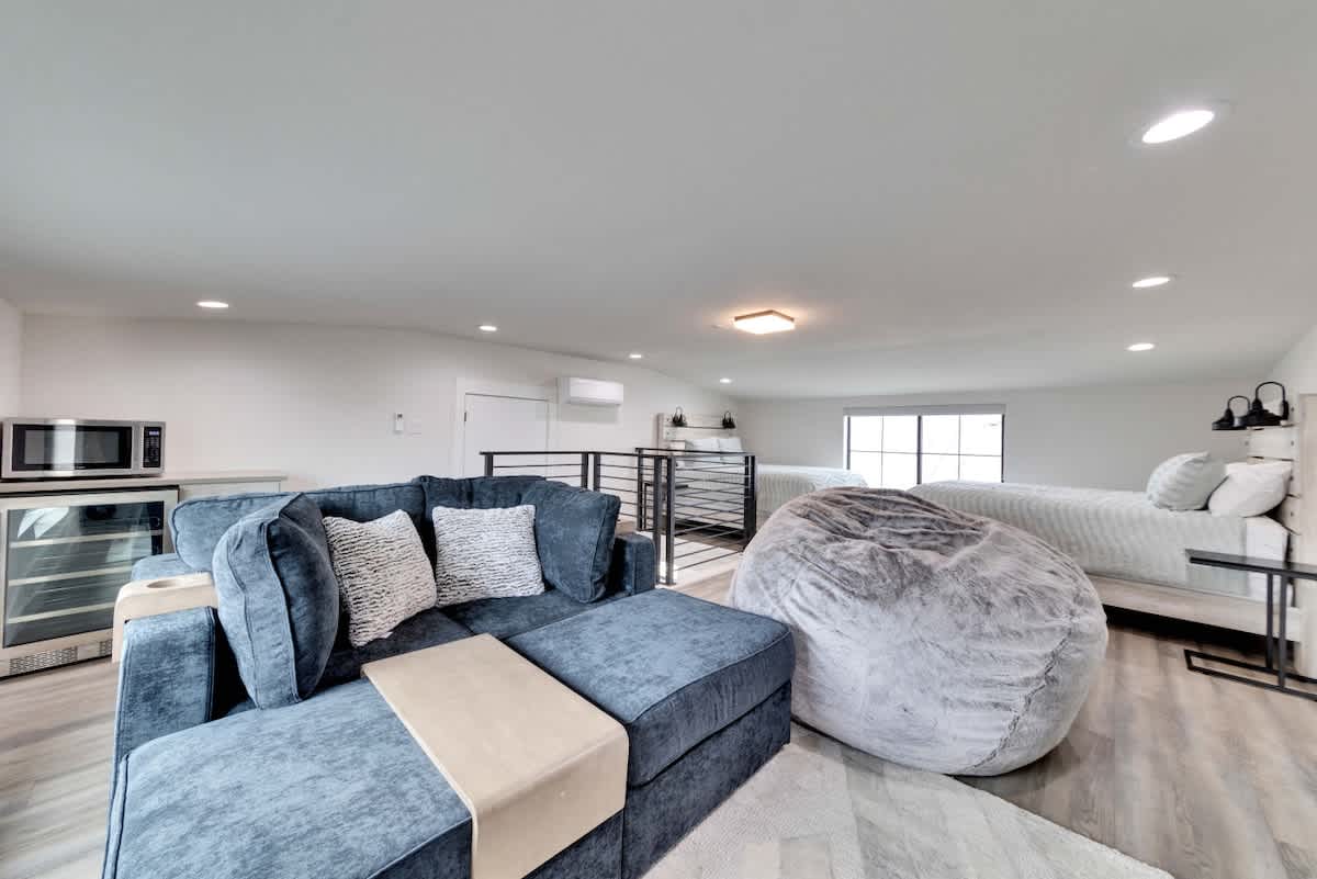 3rd Level Loft – Ladder-accessed with 2 queen beds, Smart TV, sofa, LoveSac, microwave, and beverage fridge (not recommended for young kids).