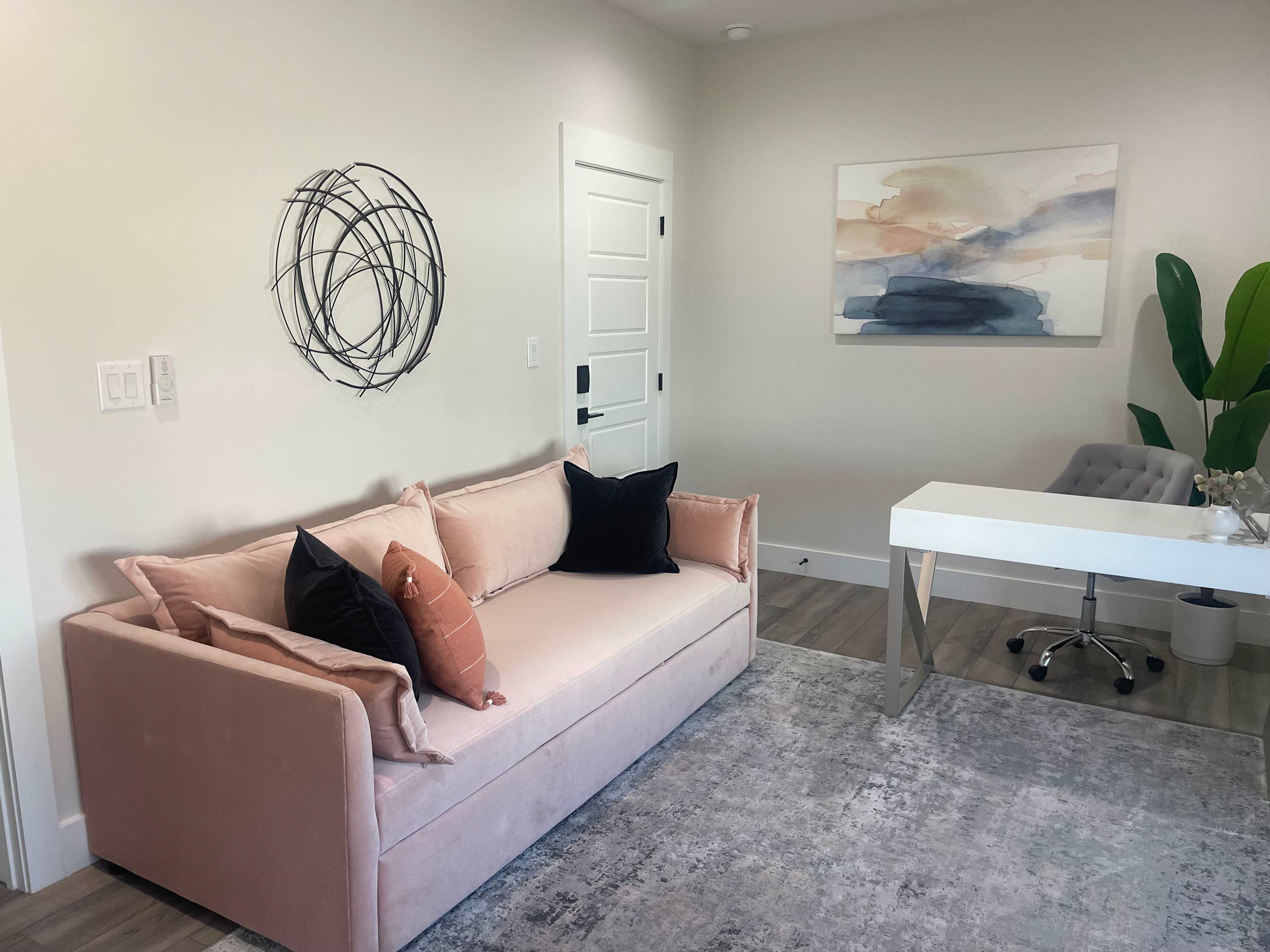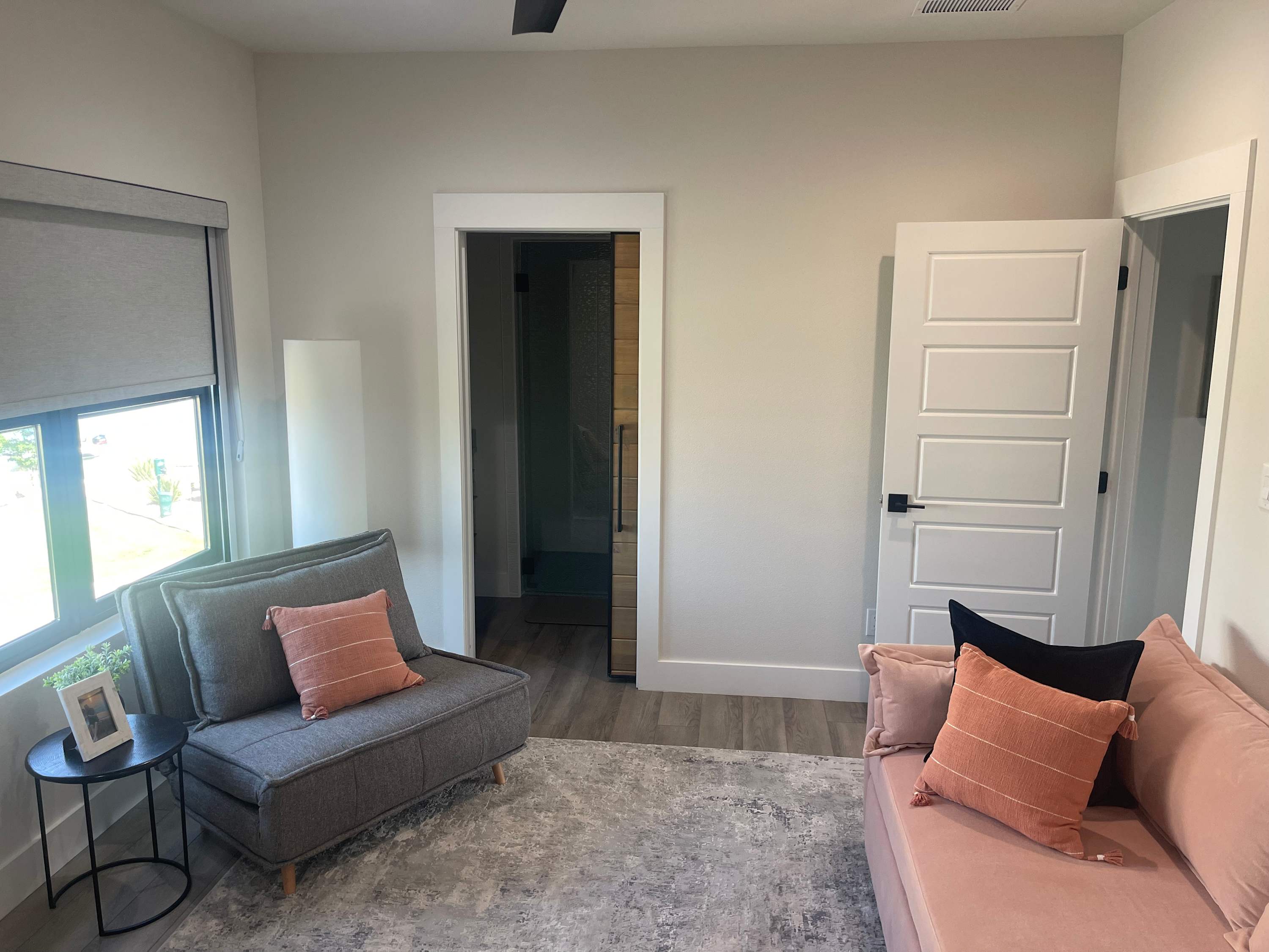 Main Floor Office/Bedroom – Queen sofa bed, fold-out twin, desk, walk-in closet, and lake views. Attached full bath with shower.