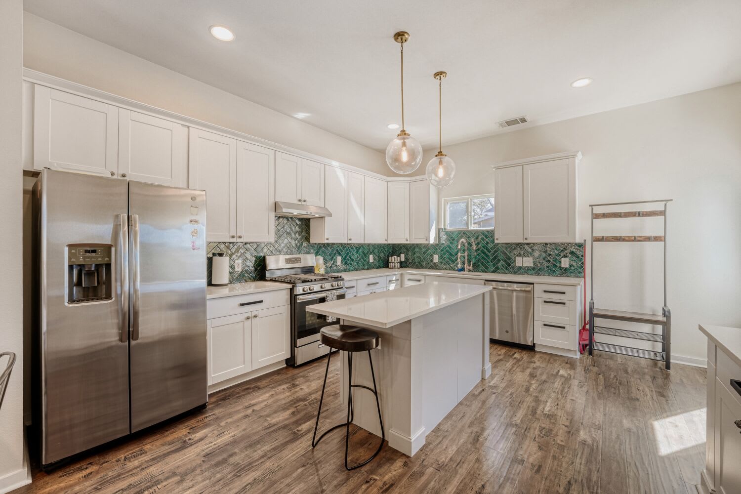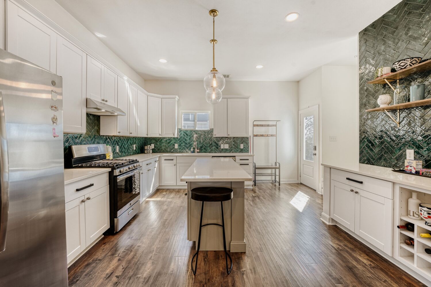 The sleek kitchen is made for more than just mornings. Outfitted with stainless steel appliances, vent hood, subway tile backsplash, built-ins (including microwave + mini fridge), and an island with bar seating...this space flexes for coffee rituals, quick bites, or full dinner spreads.