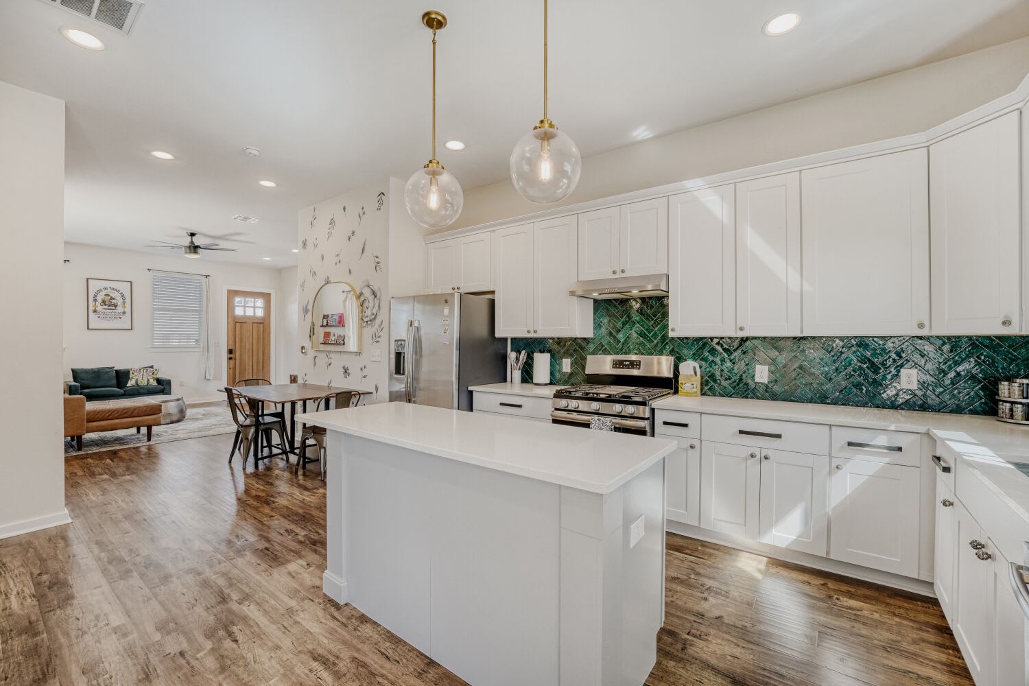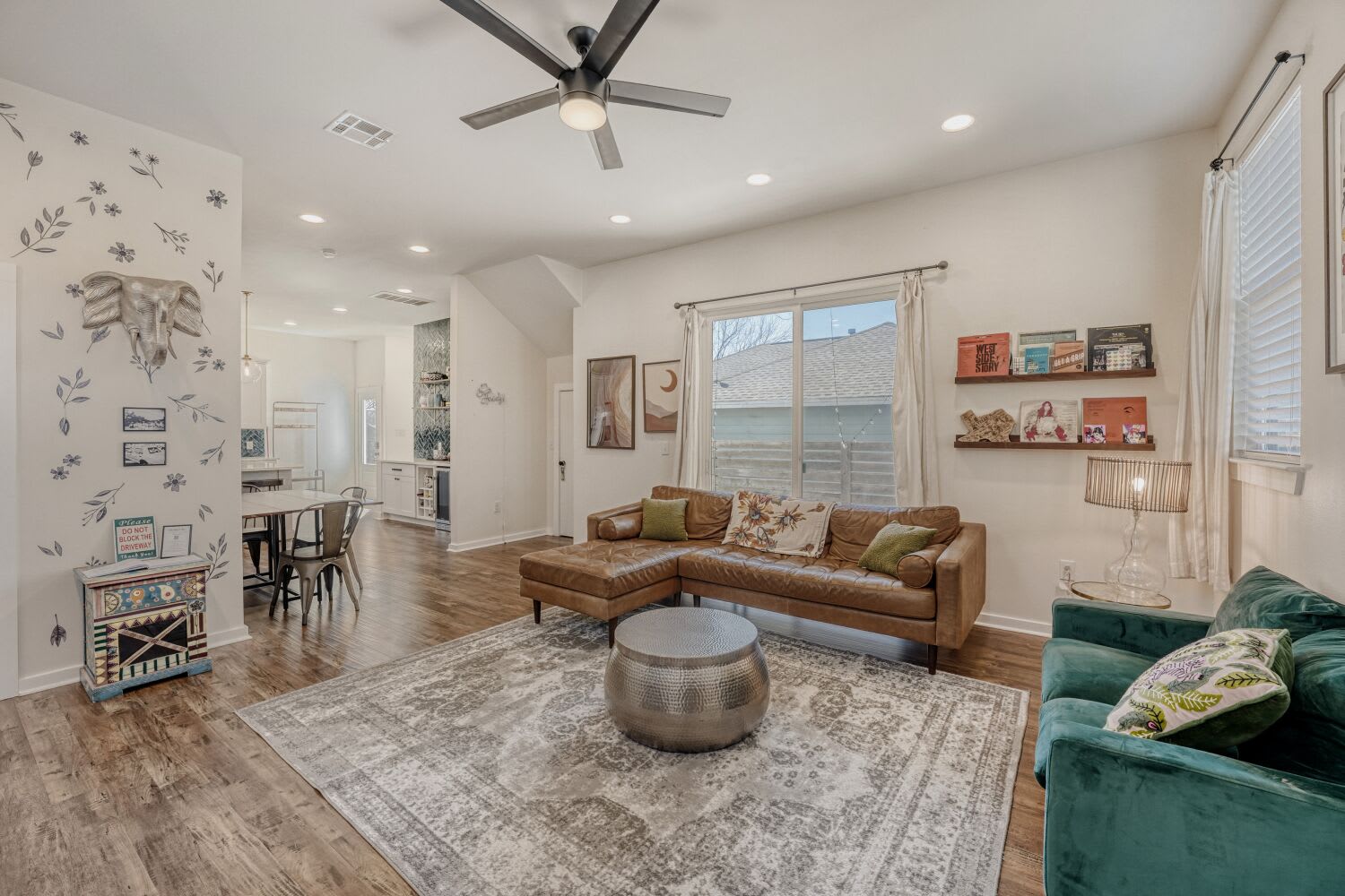 A bright, open-concept layout invites you to settle in. The living area features comfortable seating, curated decor, and a smart TV for streaming your favorites. Slide into the dining space for easy meals, game-day takeout, or pre-show drinks before heading downtown or to The Domain.