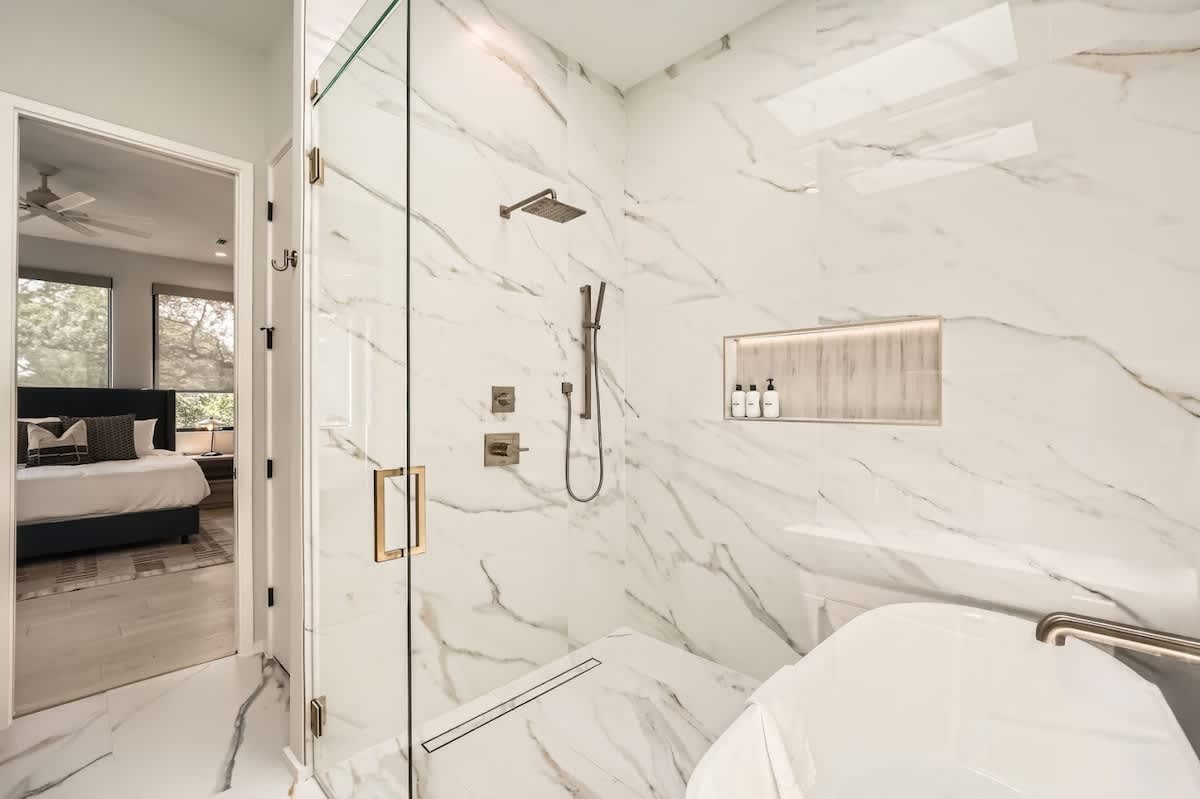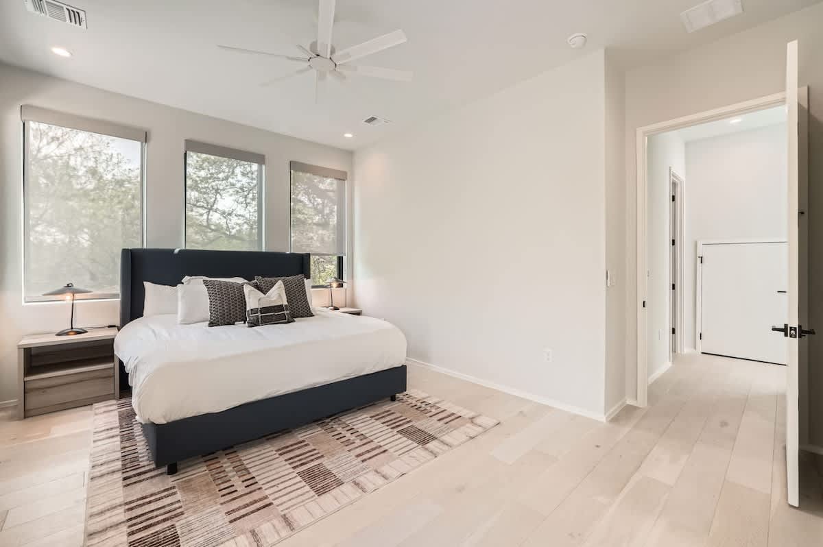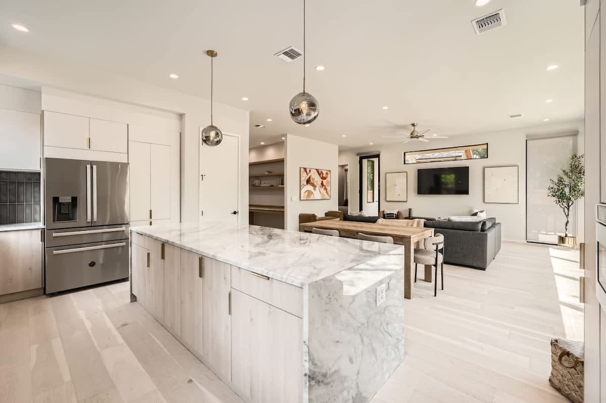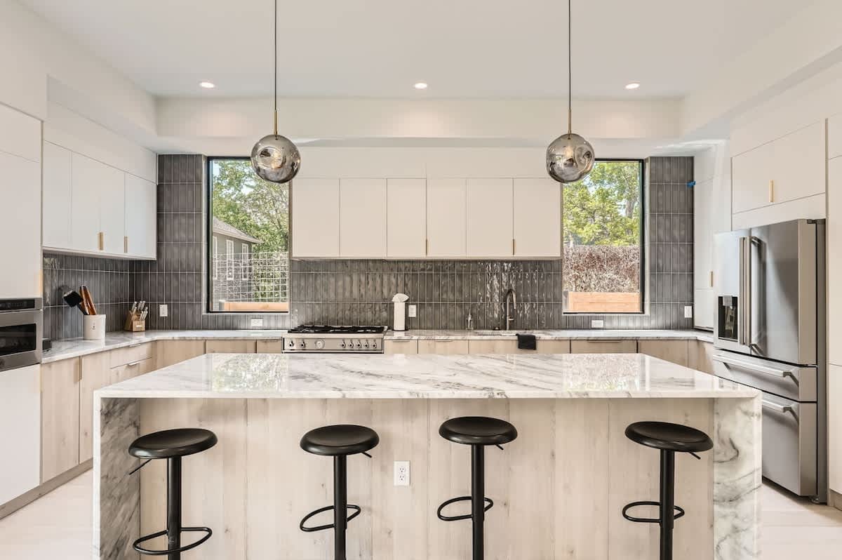 The chef’s kitchen is designed for entertaining with premium appliances, sleek countertops, and a central island. Perfect for a group brunch before a UT game or cocktails before heading out on South Congress.
