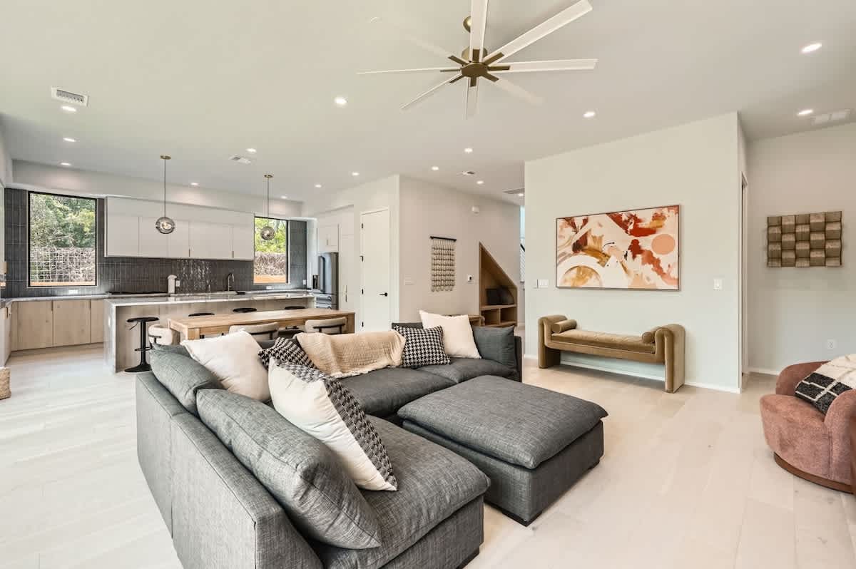 The open-concept living space is filled with natural light and features soaring ceilings, oversized sliding doors, and a spacious lounge. Gather in the dining area or relax in the living room before heading out to explore Austin’s nightlife.