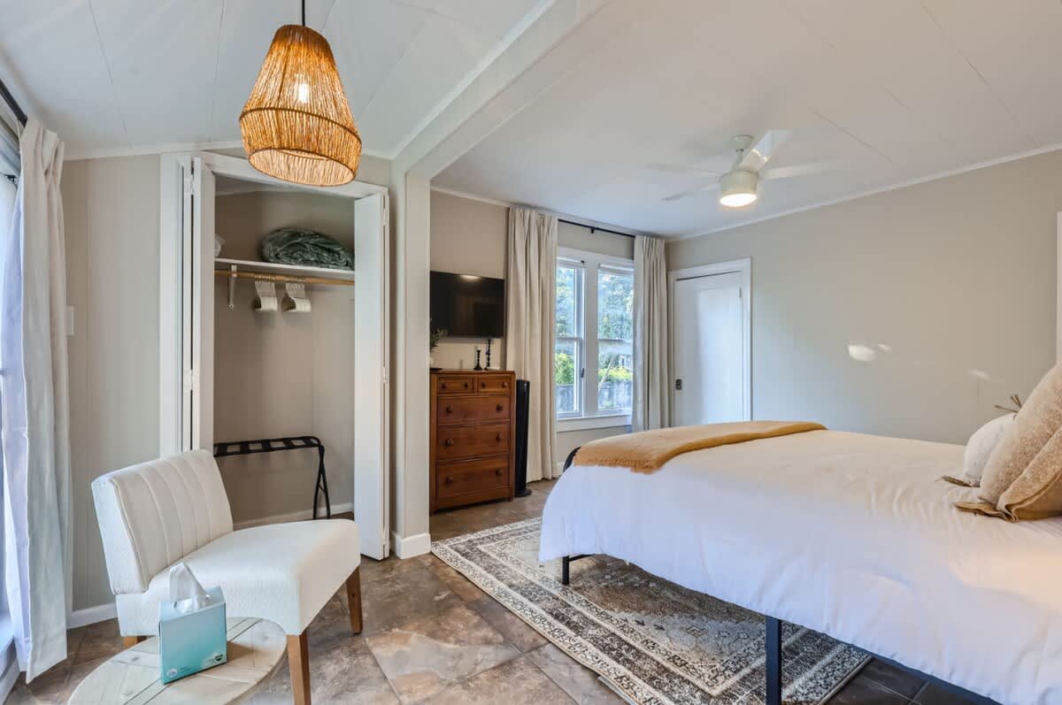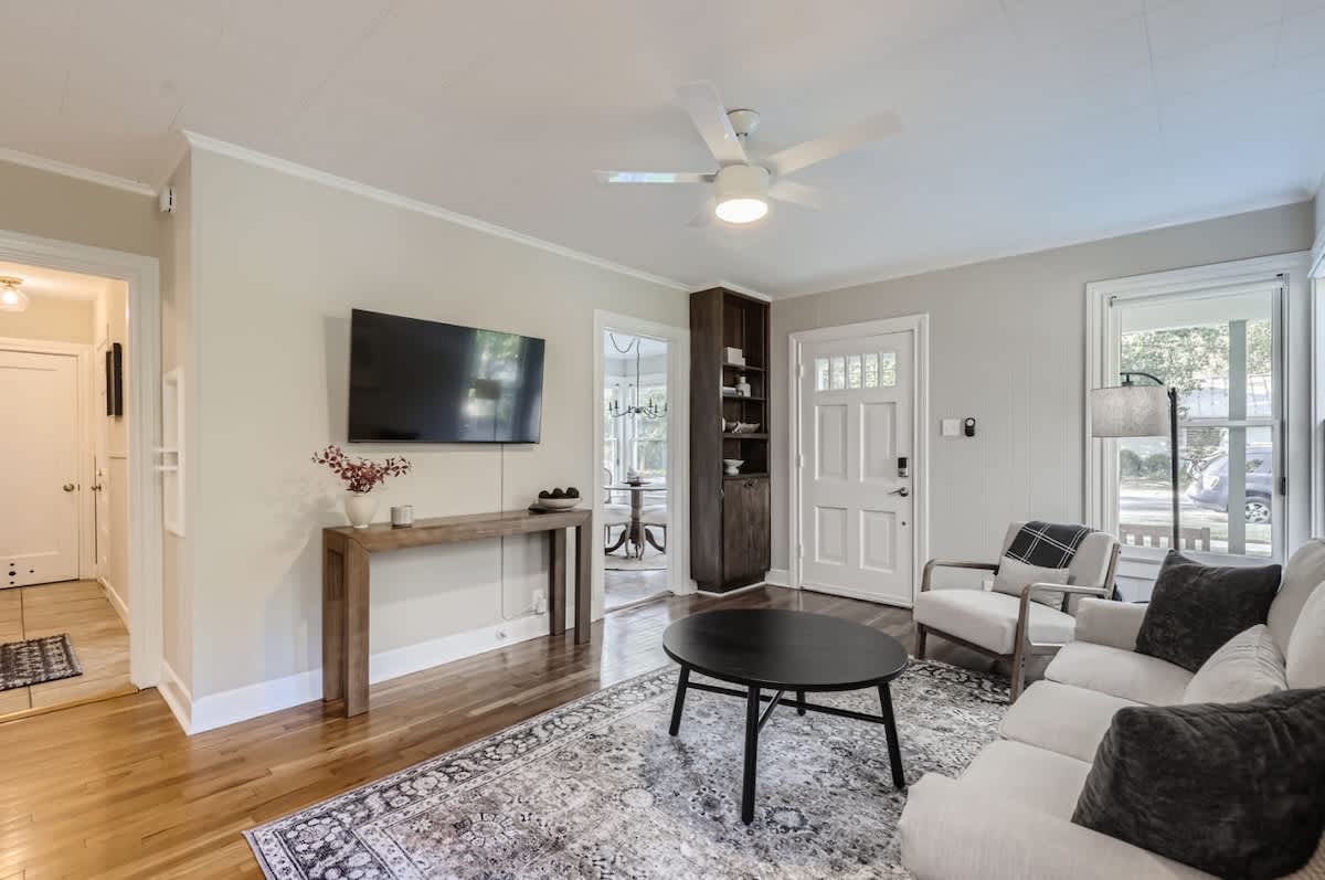 Step into this cozy 2-bed, 1-bath cottage in Old Town Georgetown, filled with charm and natural light. The living area offers comfortable furnishings for relaxation, while the fully equipped kitchen makes meal prep easy. The bedrooms are thoughtfully designed with cozy linens and plenty of storage, ensuring a restful stay. Enjoy your coffee on the front porch or unwind in the private fenced backyard with a table and chairs. The screened-in outdoor entertainment area offers darts, yard games, and space to relax with friends and family.