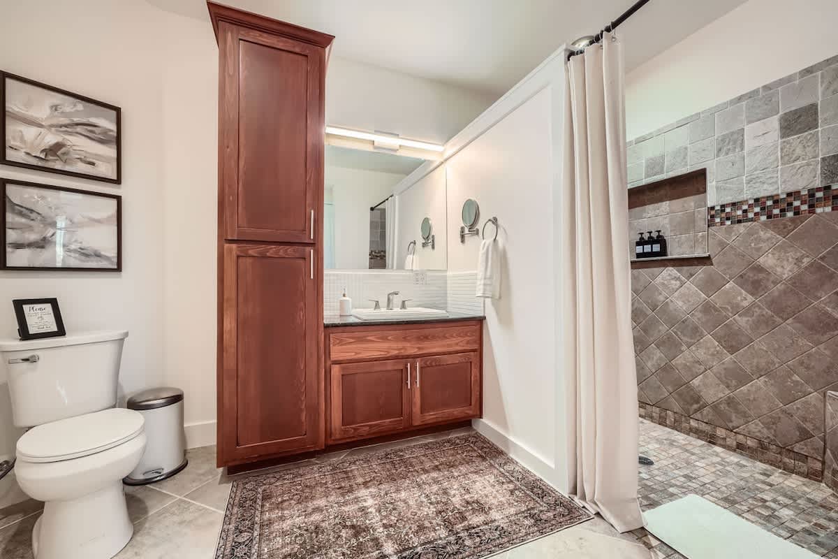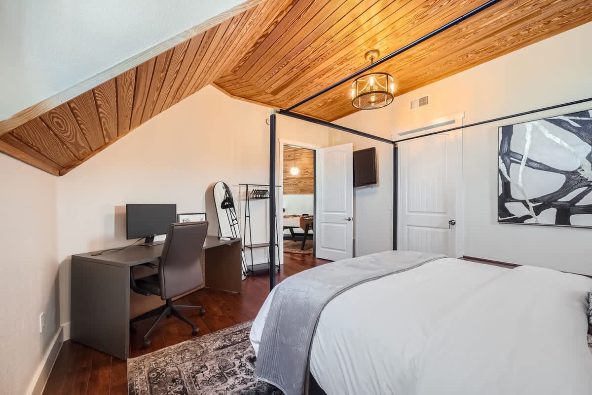 This thoughtfully designed home offers comfort and functionality in every room. The master bedroom features a brand-new king-size four-poster bed and a spacious walk-in closet, perfect for storing your luggage during your stay.. Upstairs, the queen bedroom doubles as a remote work haven with a large desk and office chairs. The accessible bathroom boasts a luxurious three shower head setup, while the stylish living room invites relaxation with plush seating, a Fire Stick-equipped TV, and a 12-foot projector screen. Gather around the solid marble dining table for shared meals, or enjoy the fully equipped kitchen with a dedicated coffee and tea bar. Outside, the cozy porch with a propane fireplace, seating, and an al fresco dining area completes this inviting retreat.