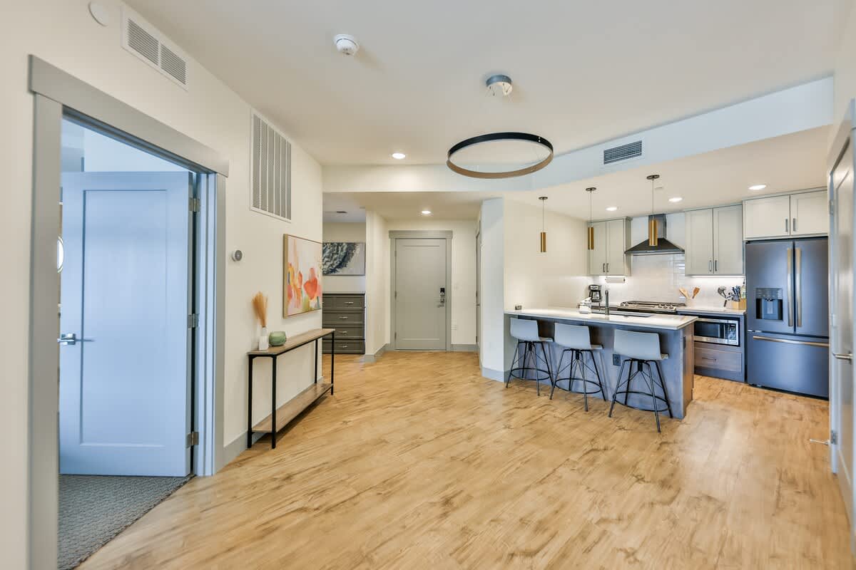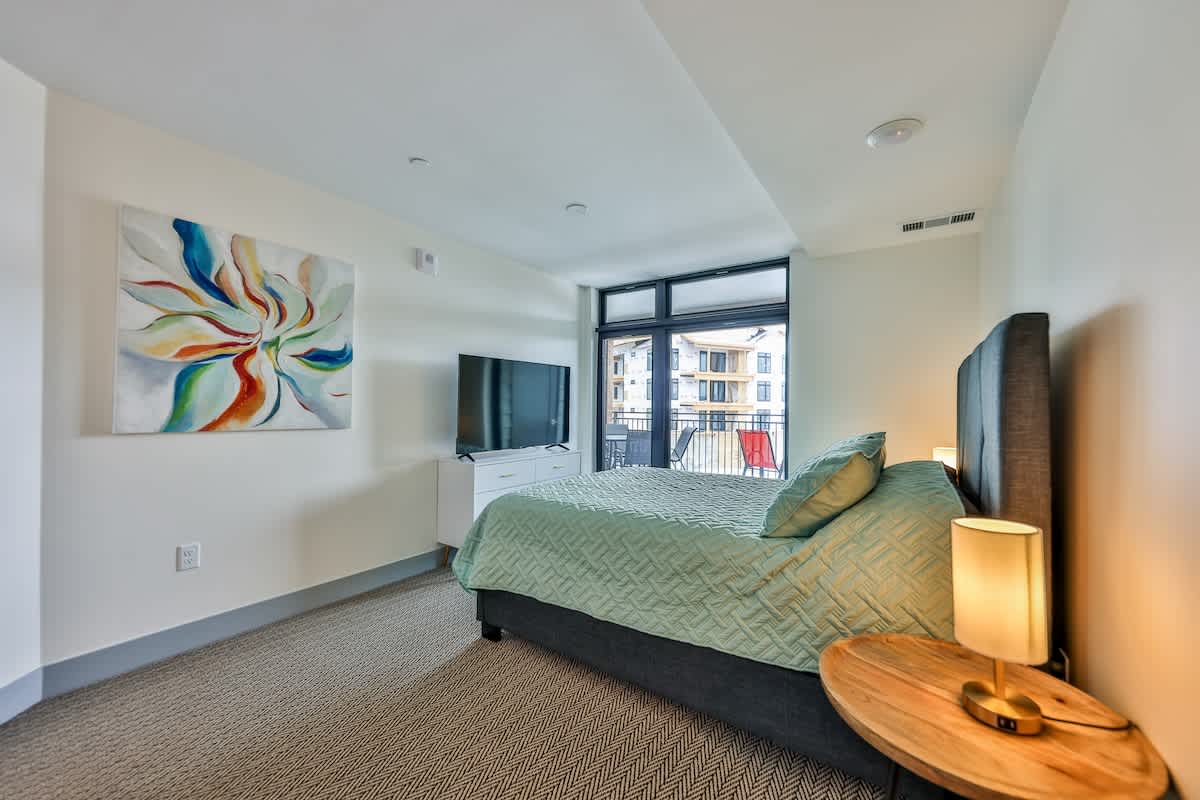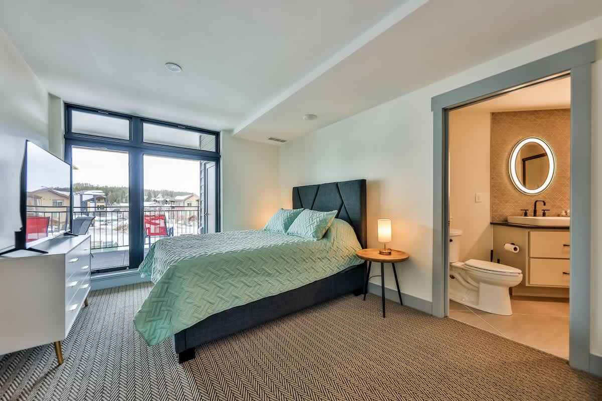 Unwind in the stylish living room with a plush sleeper sofa, smart TV, and mountain-inspired décor. The private bedroom features a comfortable queen bed, while the convenient Murphy bed transforms the space into a full retreat for larger groups.